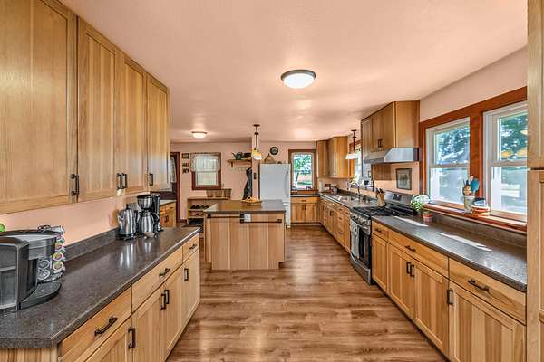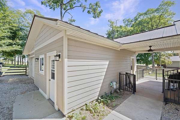 Discover the perfect blend of comfort and country living with this spacious home, guest house, and fully equipped hobby farm setup. The main home features hardwood floors, a large living room with fireplace, and beautiful glass-panel pocket doors. The sunny kitchen offers an abundance of Medallion hickory cabinets, while the main-level bedroom connects to a tile walk-in shower. Upstairs, large bedrooms provide plenty of space. Recent updates include LP Smartside siding and a new standing seam metal roof. Enjoy evenings on the expansive front porch with composite decking and roll-down shades, overlooking the playset and huge yard. A breezeway connects the home to a heated shop and garage, while the fenced yard is ideal for pets. The property also boasts apple and peach trees plus mature landscaping. A rustic yet charming guest house adds extra living space with a full kitchen, bath, bedroom, and barn-door accents-perfect for visitors or multi-generational living. Outdoor enthusiasts will appreciate the fenced pasture, horse stalls, tack room, and lean-to. The large pole shed, re-sided and re-roofed in 2024-2025, offers a loft, insulated warm room, wood storage, and organized space for equipment and supplies. Former kennel space has been adapted for livestock and includes a handy meat shop with cooler. With endless possibilities,whether for horses, hobby farming, or simply enjoying country life. This property is truly a must-see!