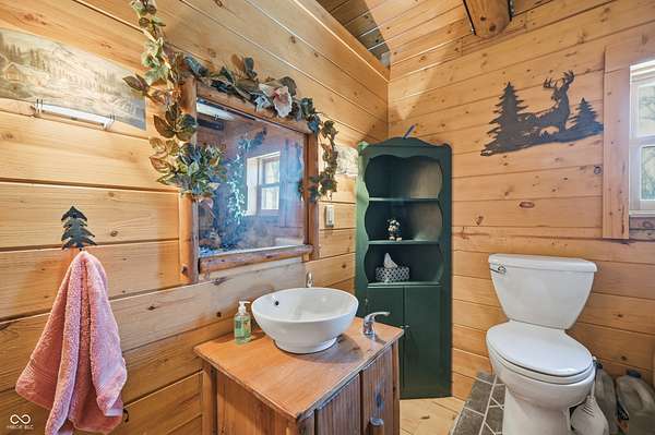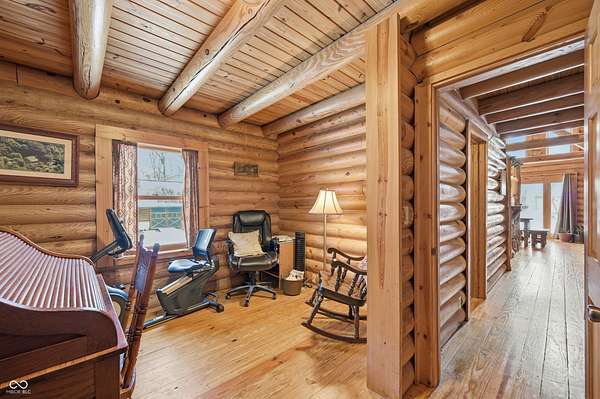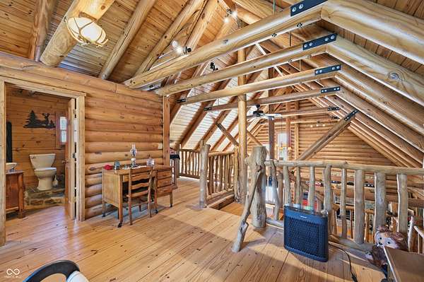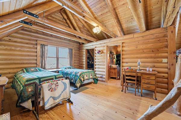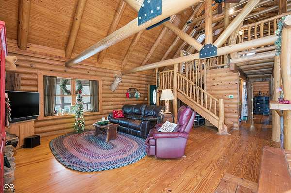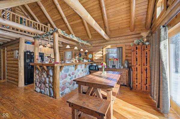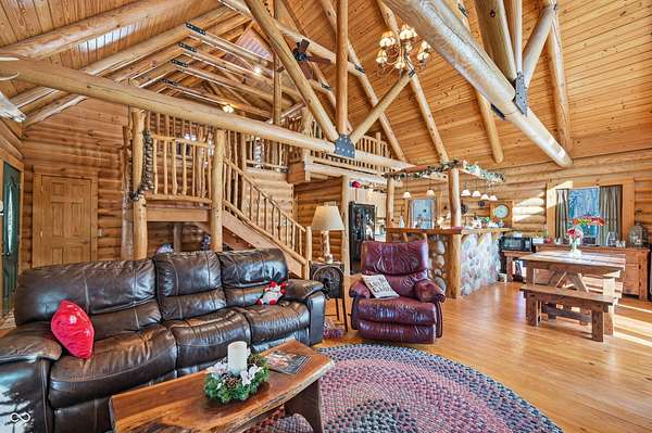 Set on over 5 acres, this one-of-a-kind property offers a rare opportunity to enjoy peaceful country living with striking architectural character. The living room is a true showpiece, featuring a soaring vaulted, beamed wood ceiling, a dramatic log wall, a wood-burning fireplace with insert, and a custom TV stand-creating a warm and inviting space filled with natural light. The kitchen blends rustic charm with modern function, offering stone countertops and a peninsula ideal for casual dining and gatherings. With 1,708 square feet across a 1.5-story layout, the home includes three bedrooms and two full bathrooms, with bedrooms serving as quiet, comfortable retreats. Additional highlights include an oversized detached two-car garage with ample space for storage or a workshop, hard-wired smoke detectors, a whole-house surge protector, recently pumped septic system, and a chimney that has been cleaned annually. Step onto the porch to take in the surrounding acreage and enjoy tranquil mornings or relaxing evenings outdoors. Built in 2007, this distinctive home seamlessly combines comfort, functionality, and the beauty of its expansive setting.