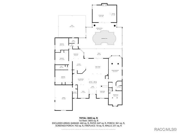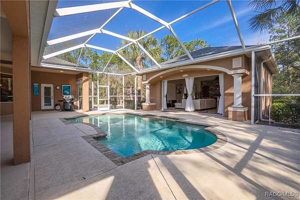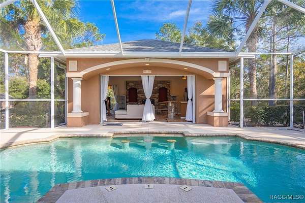 This elegant 2010 residence offers 4 bedrooms, 3 bathrooms, and a 3-car side-entry garage on 2.75 beautifully maintained acres in the prestigious Pine Ridge equestrian community. Boasting 4,072 square feet of refined living space, the home features a formal living room, formal dining room, and a spacious great room enhanced by an electric fireplace, architectural pillars, and triple sliders that fully open to the stunning pool and cabana area. The gourmet kitchen is complete with granite countertops, rich wood cabinetry, stainless steel appliances, a pantry, an island breakfast bar, and an inviting eat-in nook. A split floor plan provides privacy, with the primary suite offering a sitting room, tray ceilings, two walk-in closets, and an indulgent bathroom showcasing dual sinks, a garden tub, dual shower heads, and a walk-in shower. The home also includes a dedicated pool bath, a covered double-door entry, and an open layout ideal for both everyday living and entertaining. Outdoors, enjoy a resort-style screened and enclosed 40x20 pool equipped with solar panels, a pavered entertaining area with a brick pizza oven, and a covered rear lanai perfect for year-round relaxation. The impressive 546 sq. ft. cabana features a full kitchen and an electric fireplace, creating an exceptional space for gatherings. The circular driveway and landscaping complete this remarkable property, offering privacy, luxury, and exceptional indoor-outdoor living.