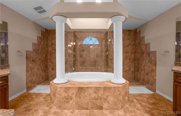 - Bathtub, Bookcases, Breakfast Bar, Dual Sinks, Eat In Kitchen, Fireplace, Garden Tub Roman Tub, Laminate Counters, Open Floorplan, Pantry, Primary Suite, Separate Shower, Sitting Area In Primary, Solid Surface Counters, Split Bedrooms, Tray Ceilings, Tub Shower, Walk In Closets, Wet Bar, Window Treatments, Wood Cabinets