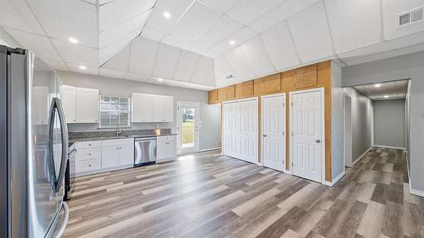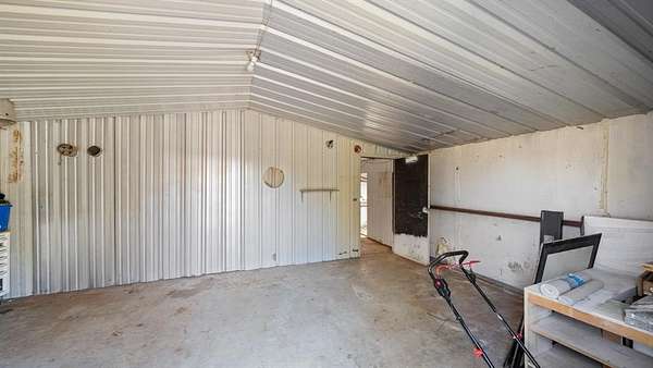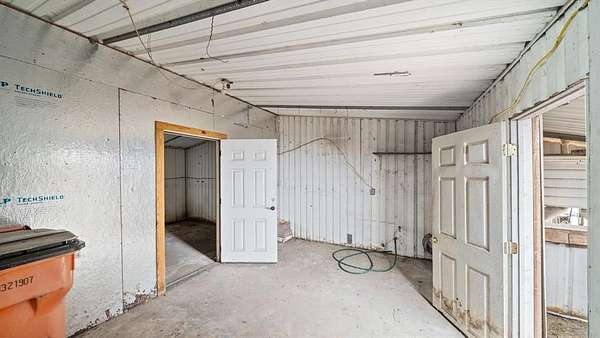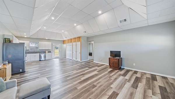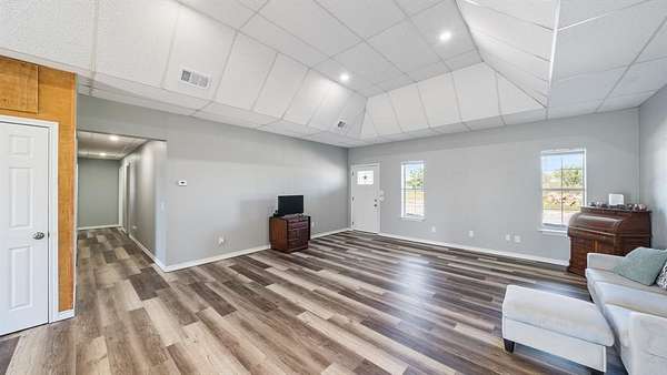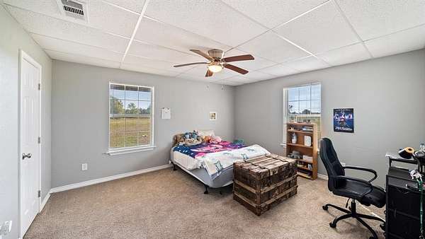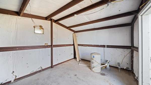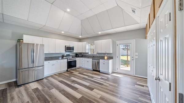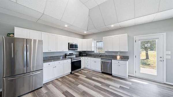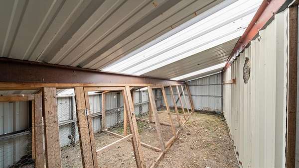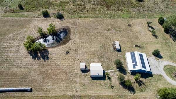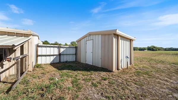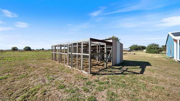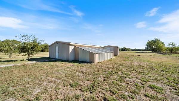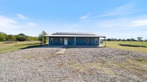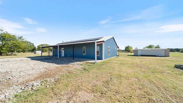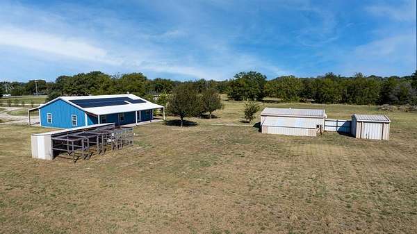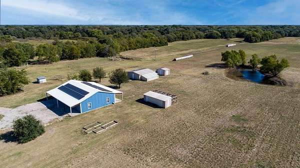 Discover country living with modern comfort on this beautiful unrestricted property! Situated on + or - 7.46 acres, this versatile land offers open pasture, mature trees, and a peaceful pond--ready for your livestock, business, or homestead vision. The updated barndominium-style home features an open-concept layout with vaulted ceilings, luxury vinyl plank flooring, granite counters, and stainless appliances. Enjoy natural light throughout. Outbuildings include a large metal barn, sheds, and chicken coops, offering space for projects, animals, or storage. Private gated entry, long driveway, and easy access to major roads provide privacy with convenience. A perfect blend of freedom, function, and rural tranquility--no HOA, no city taxes, and no restrictions!