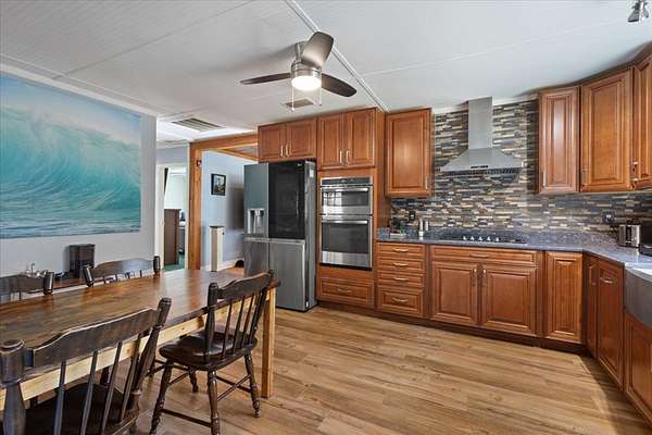 - Blinds, Built-In Oven, Ceiling Fans, Eat-In Kitchen, Gas Cook Top, Granite Counter, Kitchen/Dining Combo, Laundry/Utility Room, Living Room, Microwave, Water Softener, Wood Cabinets, w/ Hookups