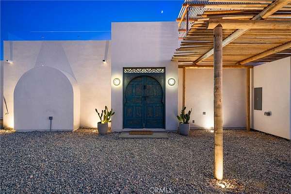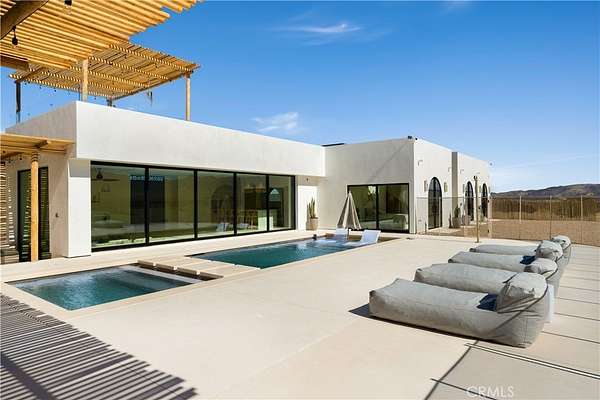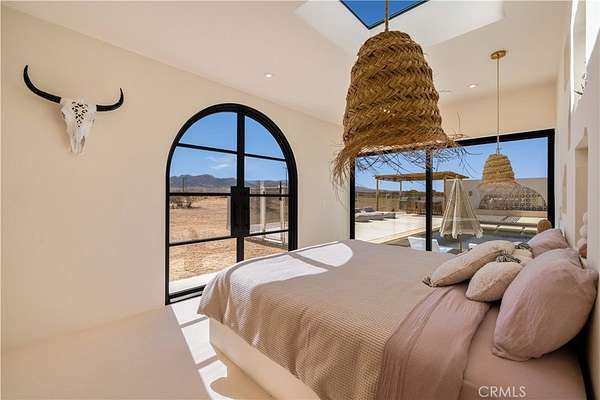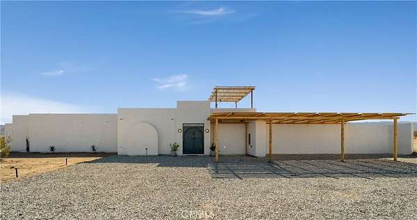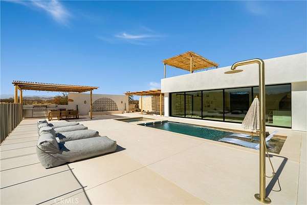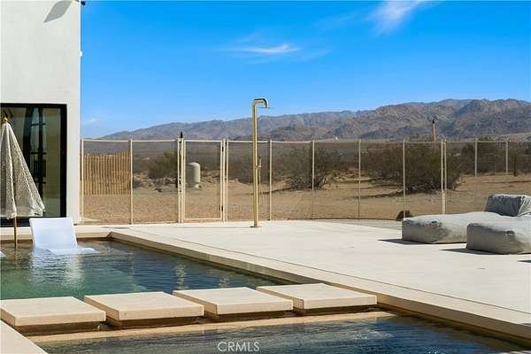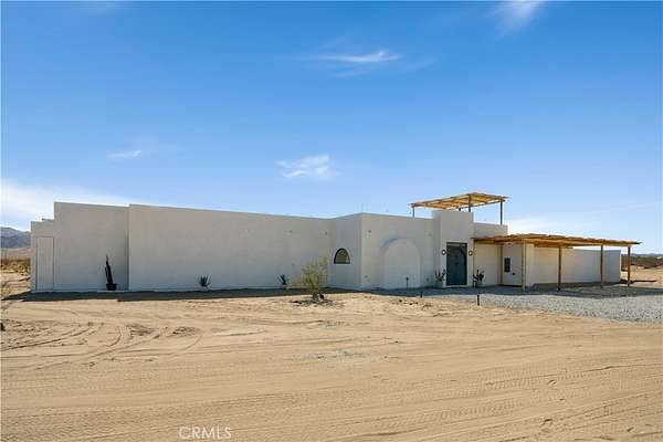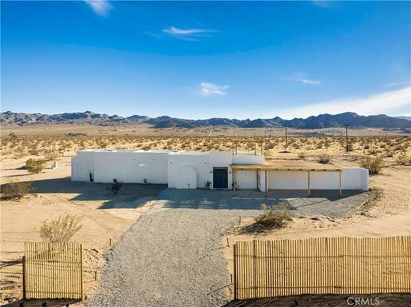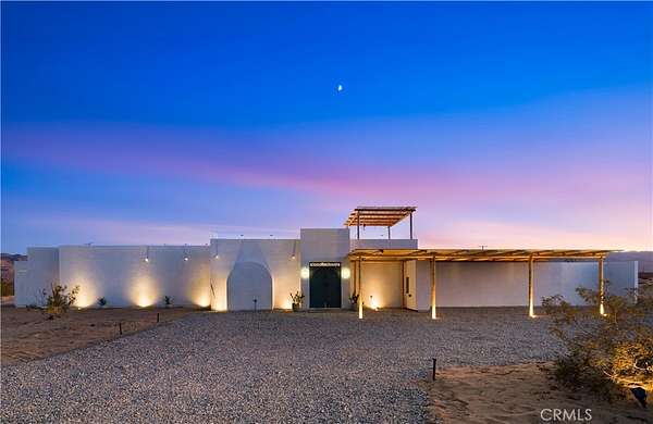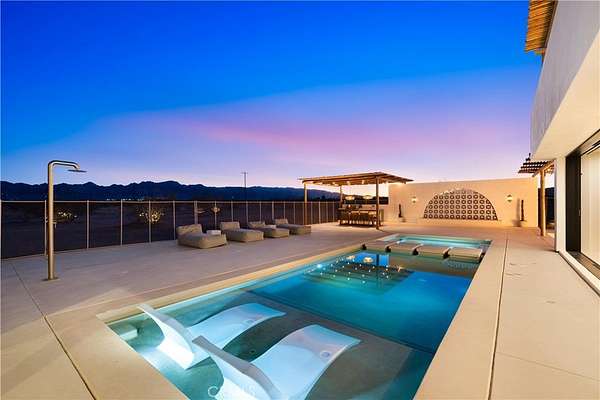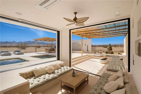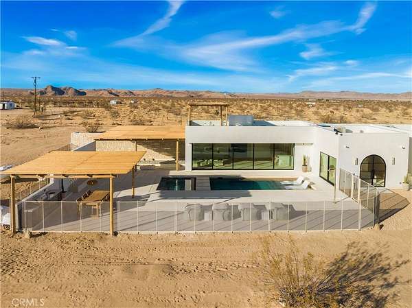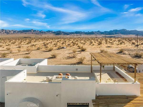 Welcome to your dream home - a unique 1,540 sq. ft. Ibiza-style residence nestled in the breathtaking desert landscape. This fully custom property offers an unparalleled living experience, perfectly designed for both relaxation and entertainment. Upon entering this exquisite home, you will be greeted by an impressive 30-foot pocket door that seamlessly merges indoor and outdoor living, allowing you to fully appreciate the natural beauty of the surrounding 2.18 acres, complete with stunning views of the Joshua Tree Monument. The design promotes an effortless flow throughout the space, making it ideal for gatherings or tranquil evenings. Step outside to discover over 700 sq. ft. of rooftop space, featuring a stylish pergola that provides 360-degree views of the desert landscape--an ideal backdrop for sunset cocktails or stargazing. The expansive outdoor deck boasts a sunken seating area capable of accommodating over 20 guests, making it an entertainer's paradise. This home is meticulously crafted with imported custom furniture and finishes, showcasing the finest materials. Each corner of this residence radiates charm and sophistication. Culinary enthusiasts will appreciate the full BBQ kitchen, perfect for summer cookouts, while the sunken fire pit and additional rooftop fire pit create an inviting ambiance for evening gatherings under the stars. Adding to the allure of this property is a large pool complemented by an oversized jacuzzi, providing a luxurious retreat perfect for both the hot desert days and chilly nights. Secluded yet accessible, this property represents a fantastic investment opportunity or an idyllic vacation home. Equipped with a well system, solar power, and an EV charger, this residence combines sustainability with luxury living. Don't miss your chance to own this extraordinary desert retreat--a true gem that encapsulates the essence of modern living in harmony with nature. Schedule your private tour today!