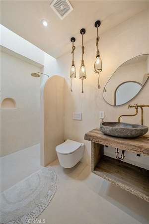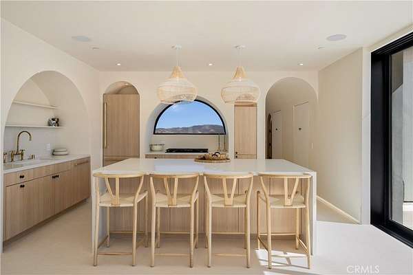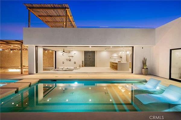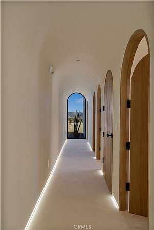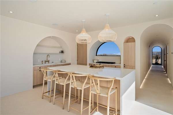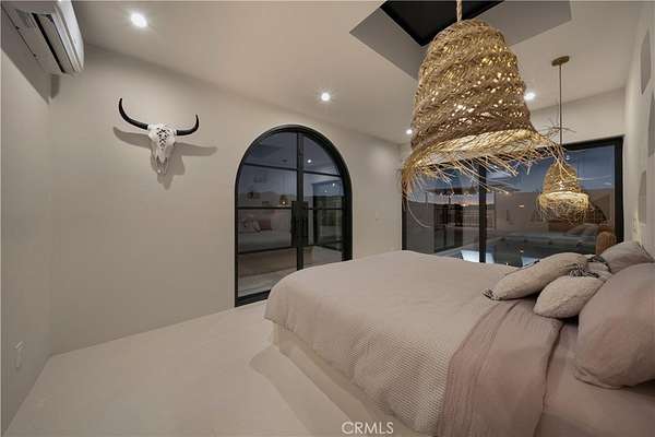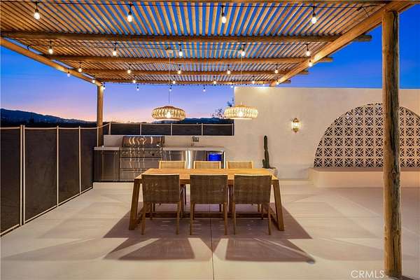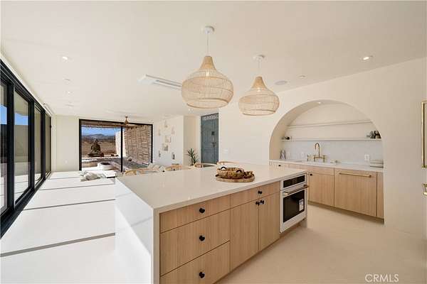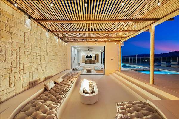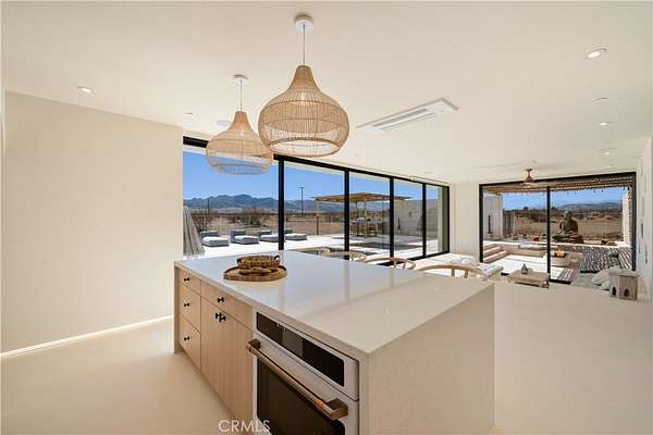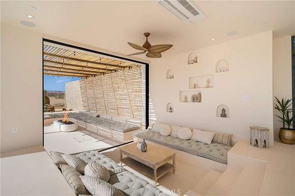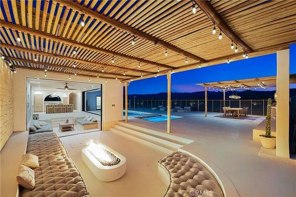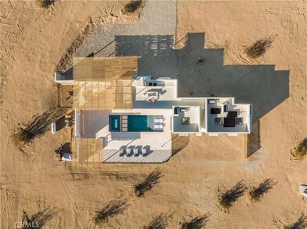 Welcome to your dream home - a unique 1,540 sq. ft. Ibiza-style residence nestled in the breathtaking desert landscape. This fully custom property offers an unparalleled living experience, perfectly designed for both relaxation and entertainment. Upon entering this exquisite home, you will be greeted by an impressive 30-foot pocket door that seamlessly merges indoor and outdoor living, allowing you to fully appreciate the natural beauty of the surrounding 2.18 acres, complete with stunning views of the Joshua Tree Monument. The design promotes an effortless flow throughout the space, making it ideal for gatherings or tranquil evenings. Step outside to discover over 700 sq. ft. of rooftop space, featuring a stylish pergola that provides 360-degree views of the desert landscape--an ideal backdrop for sunset cocktails or stargazing. The expansive outdoor deck boasts a sunken seating area capable of accommodating over 20 guests, making it an entertainer's paradise. This home is meticulously crafted with imported custom furniture and finishes, showcasing the finest materials. Each corner of this residence radiates charm and sophistication. Culinary enthusiasts will appreciate the full BBQ kitchen, perfect for summer cookouts, while the sunken fire pit and additional rooftop fire pit create an inviting ambiance for evening gatherings under the stars. Adding to the allure of this property is a large pool complemented by an oversized jacuzzi, providing a luxurious retreat perfect for both the hot desert days and chilly nights. Secluded yet accessible, this property represents a fantastic investment opportunity or an idyllic vacation home. Equipped with a well system, solar power, and an EV charger, this residence combines sustainability with luxury living. Don't miss your chance to own this extraordinary desert retreat--a true gem that encapsulates the essence of modern living in harmony with nature. Schedule your private tour today!