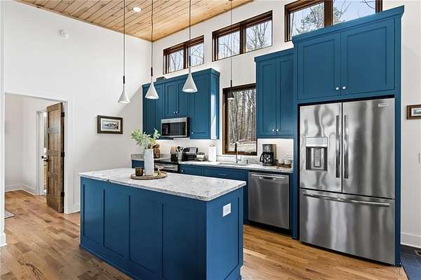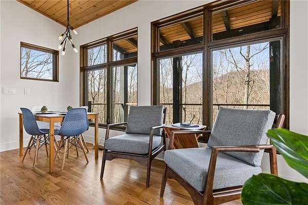 Wake up to breathtaking views and the peaceful beauty of North Georgia in this stunning, custom built, modern rustic Grandview Lake retreat that truly feels like new. Perfectly positioned to capture the water and mountain scenery, this home features beautiful cypress siding and blends warm, custom craftsmanship with a bright and airy open concept design that makes everyday living feel like a getaway. Inside, natural textures, accent lighting throughout and thoughtful details create a welcoming atmosphere. Wood floors, planked ceilings, and beautiful wood accents bring warmth throughout the home, while a shiplap accent wall, custom bookcases, and a charming woodburning stove add character and comfort to the main living space. The open layout flows effortlessly into the kitchen, where leathered granite countertops, stainless steel appliances, recessed lighting, and stylish finishes create a space that is both sophisticated and beautiful for everyday living and entertaining. Large custom windows frame the incredible views and fill the home with natural light, making every room feel bright, spacious, and connected to the surrounding landscape. Outside you will find beautiful natural landscaping and a spacious covered back deck with a stunning planked ceiling, the perfect place to relax with morning coffee or unwind in the evening while overlooking the water. Below, a beautiful stone patio off the terrace level provides another inviting outdoor living space ideal for gathering with friends, enjoying the views, or stepping right out to the backyard and down to the water. With direct access to Grandview Lake and your own private dock, enjoying lake life whether fishing, kayaking, or simply soaking in the view is right outside your door. The finished terrace level adds exceptional flexibility with an additional bedroom and full bath, ideal for a guest suite, home gym, office, or private retreat for visitors. A whole home generator provides added comfort and peace of mind year-round. Located just minutes from charming downtown Jasper, residents enjoy the best of North Georgia living with easy access to local restaurants, boutique shopping, outdoor recreation, and the natural beauty of the Appalachian foothills. Jasper offers a welcoming small-town atmosphere while still being convenient to Atlanta. Whether you're looking for a full-time residence or a relaxing lakefront escape, this thoughtfully designed home offers the perfect combination of comfort, character, and unforgettable views.