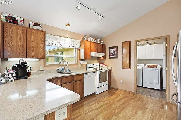 - Garage Door Opener, Laminate Flooring, Laundry, Quartz, Vinyl Floor, Wallto Wall Carpet, Washer Dryer