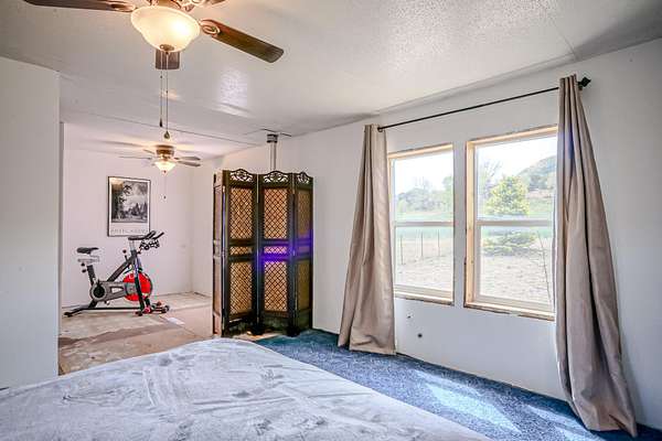 The property features numerous build sites for an additional home or barns. The residence, situated at the end of a private road, boasts 3 spacious bedrooms, 2 full baths, a large living room, an office, and an open dining area and kitchen.