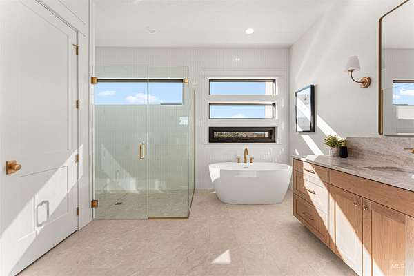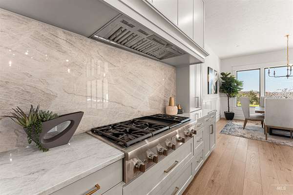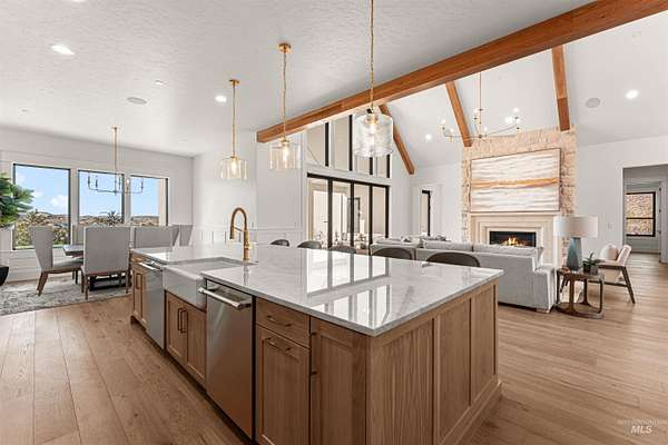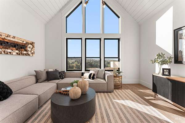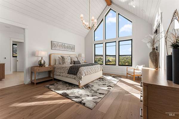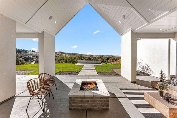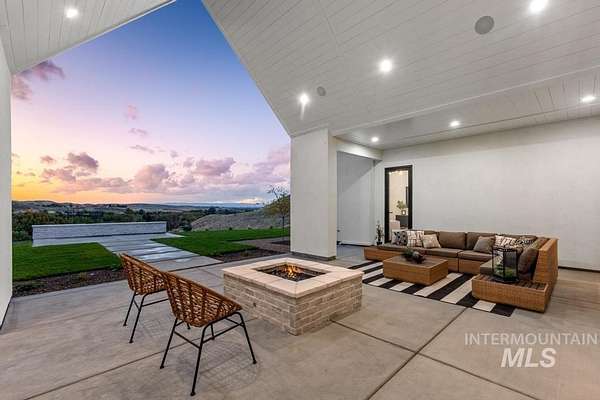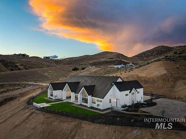 Acreage. Privacy. Views that linger. Welcome to a design-forward Eagle estate set on 10 private acres with sweeping panoramas of the foothills and Shadow Valley Golf Course. Inside, glass and light lead the way as a wall of bifold doors opens the great room to an elevated patio-framing sunrise coffees and sunset horizons. The chef's kitchen anchors the home with Taj Mahal granite, Thermador appliances, hidden pantry options, bespoke lighting, a sleek linear fireplace, and white oak floors that add quiet luxury. The primary suite offers a serene retreat with a spa-inspired bath, dual vanities, generous shower, and custom-ready closets. A true multi-gen guest suite provides independence for extended stays, while flexible spaces adapt to office, fitness, or recreation. Purpose-built for Idaho living, the estate pairs acreage freedom with elevated self-sustainability. Backup power, efficient mechanical systems, EV charging capability, and resilience-focused infrastructure support a lifestyle of independence without sacrificing comfort. A heated 2-car garage with RV bay and gear-ready storage completes the experience. Close to Eagle and Boise-yet distinctly private-this is luxury designed to endure.