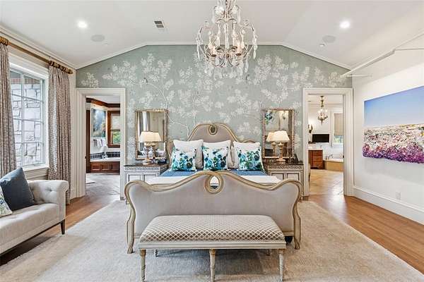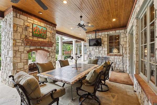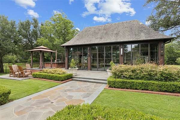French country elegance meets Texas charm on 7.7 fully fenced acres in coveted Northwest Colleyville. This 9,600 SF estate offers 7 living areas, 5 bedrooms, 7 baths, and endless amenities designed for both everyday living and grand entertaining. Inside you'll find soaring ceilings, hand-carved fireplaces, Gracie hand-painted wallpaper, a chef's kitchen with dual islands open to the breakfast area & oversize family room. The game room with onyx wet bar overlooks the backyard living. A catering scullery provides prep and cook space for entertaining large groups. The media room is perfect for private viewings. The formal living and dining rooms both open to a covered front terrace. The private executive office is fully paneled in mahogany. The primary suite is its own retreat with dual en-suite baths, custom 3 level closet, a private sitting room, safe room, and stunning views of the grounds. Out back you'll find resort-style living including a pool with beach entry, glass-walled pool house with a full kitchen and 2 luxury baths, outdoor kitchen, firepit, and putting green. Additional highlights include a 4-car garage with one bay climate-controlled and currently used as a dog room, gorgeous glass Hartley Botanic greenhouse, and very secure chicken coop. Updated systems throughout ensure comfort and peace of mind. There is an additional garage-shop-service building with 5 auto bays, space for RVs and an efficiency apartment. Wells on the property are for landscape use. This is a rare blend of sophistication, privacy, and luxury living in one of Colleyville's most desirable areas.