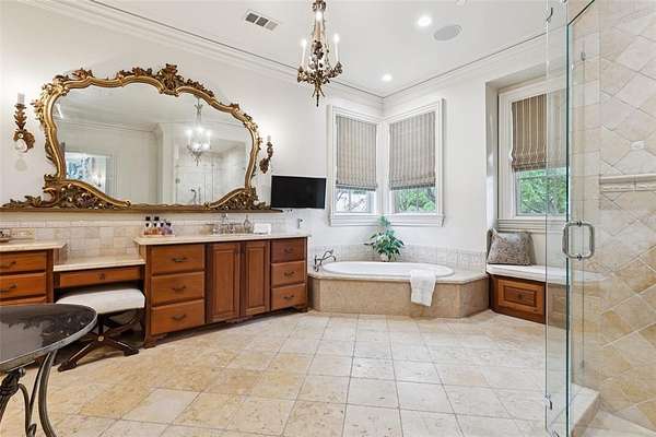 - Built-In Features, Built-In Wine Cooler, Cable TV Available, Cathedral Ceiling(s), Chandelier, Decorative Lighting, Double Vanity, Eat-In Kitchen, Elevator, Flat Screen Wiring, High Speed Internet Available, Kitchen Island, Natural Woodwork, Paneling, Pantry, Second Primary Bedroom, Vaulted Ceiling(s), Walk-In Closet(s), Wet Bar