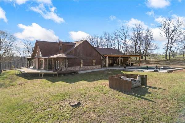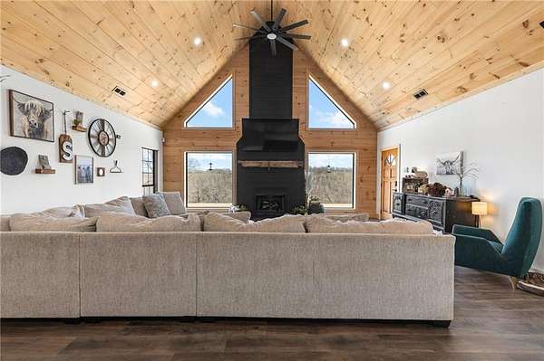 From Harrison take Cottonwood Rd. for 4.9 miles. Turn R onto Hopewell Rd. Turn L on to Parliament Drive. Driveway to home is the last driveway on the left before the iron gate. GPS Coordinates: 36.324531, -93.104428