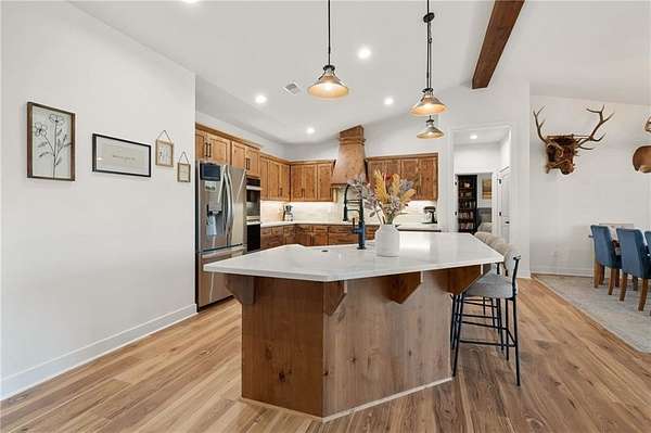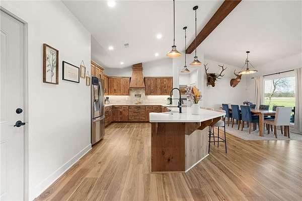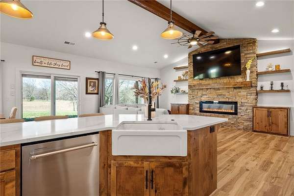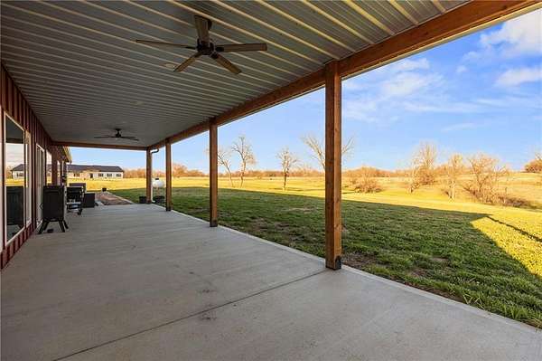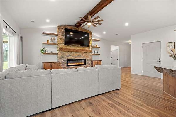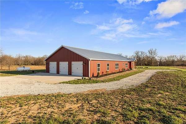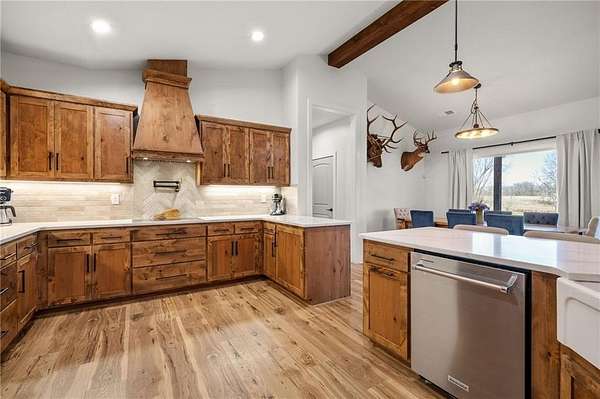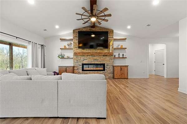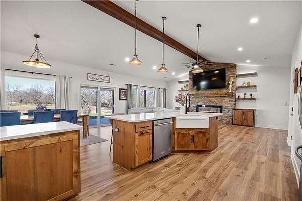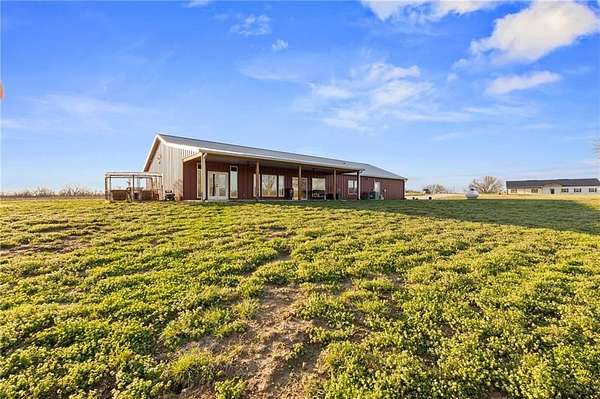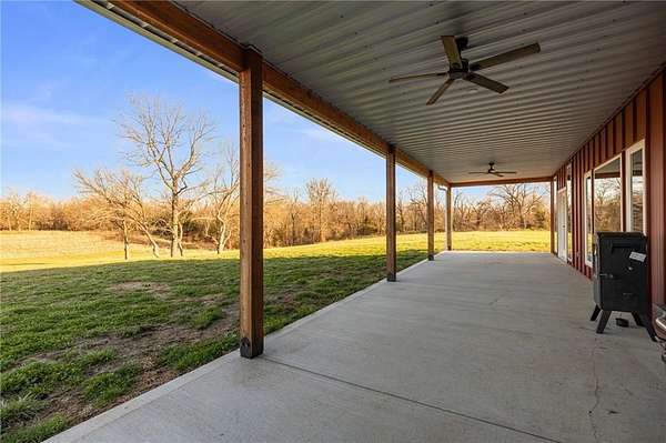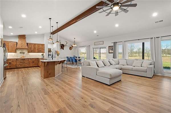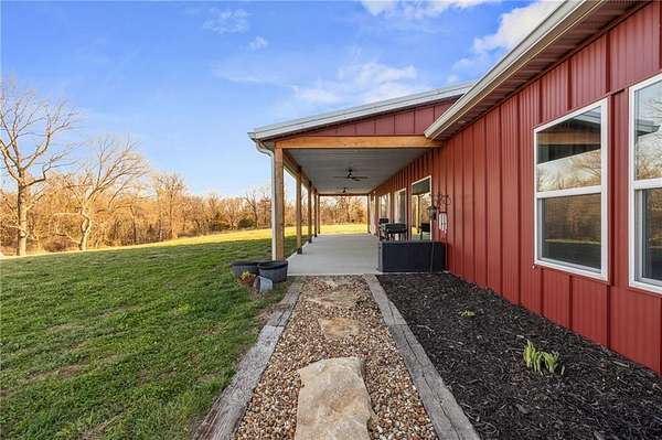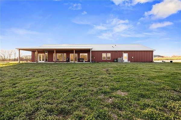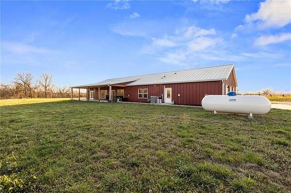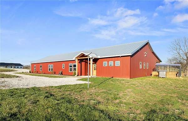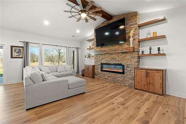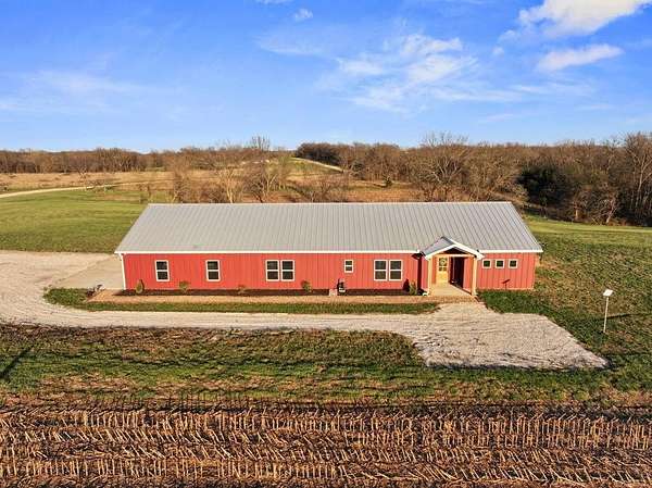 Custom-built and thoughtfully designed, this stunning home sits on 16.69 acres and offers the perfect balance of quality craftsmanship, functional living, and wide-open space. The difference is clear-this is not a builder-grade home, but one built with intention, comfort, and longevity in mind. The open-concept layout is filled with natural light, enhanced by large windows with energy-efficient tinting that provide both privacy and year-round comfort. Soaring 13-foot vaulted ceilings with exposed beams anchor the main living space, where a floor-to-ceiling stone fireplace and custom built-ins create a warm and inviting focal point. At the heart of the home, the kitchen is designed to gather. Custom cabinetry, a large center island, and double wall ovens make it equally suited for everyday living and entertaining. The walk-in pantry is also a certified safe room. The layout is both practical and flexible, offering four bedrooms-each with walk-in closets-and well-designed bathroom access for both privacy and convenience. The primary suite features a spacious walk-in closet and a beautifully finished bathroom with a large walk-in shower and dual shower heads. A Jack-and-Jill bathroom with separate sink areas and an additional bedroom with dual-access bath add to the home's smart design. Buyers will appreciate the oversized laundry room-complete with custom cabinetry, folding space, hanging storage, and a utility sink-designed to make everyday living easier. Built for efficiency and durability, the home includes heated concrete floors throughout, along with a standing seam metal roof and metal siding for long-term, low-maintenance living. The 16.69 acres offer space for recreation, outdoor living, hunting, or simply enjoying the privacy and peaceful surroundings-all while still being within convenient reach of nearby amenities. This is more than a home-it's a lifestyle property designed for comfort, function, and the way you want to live.