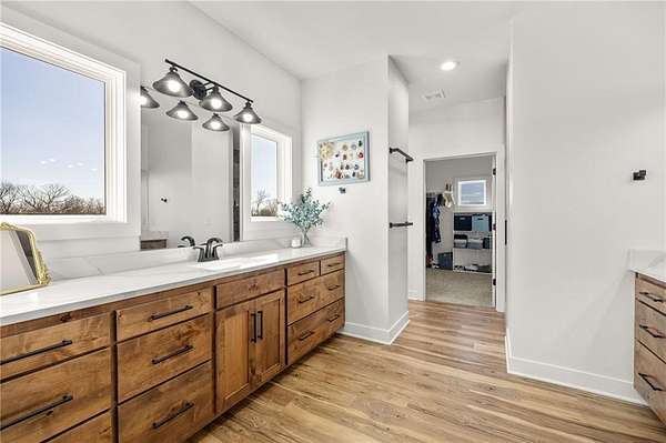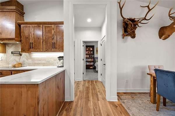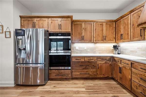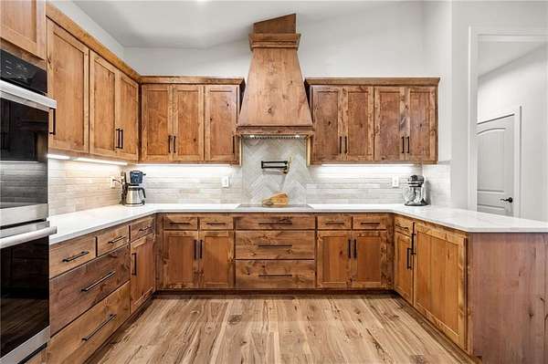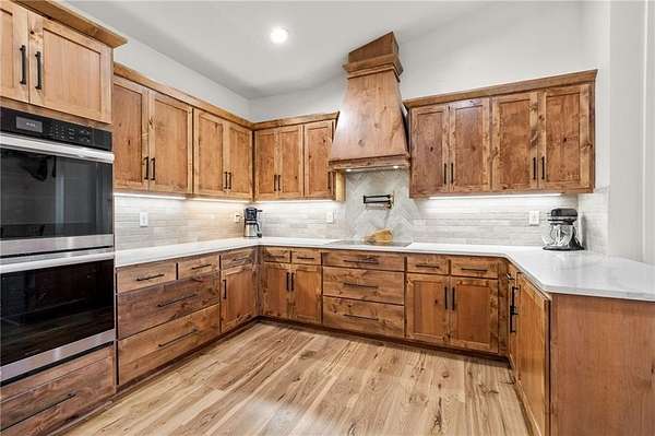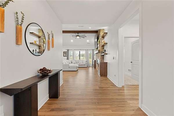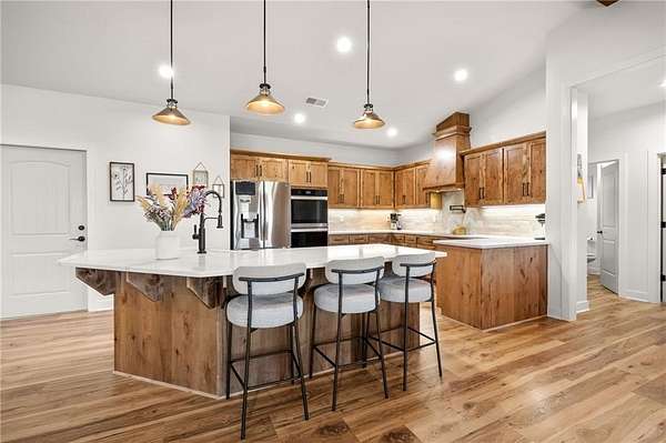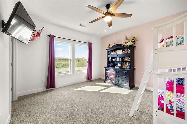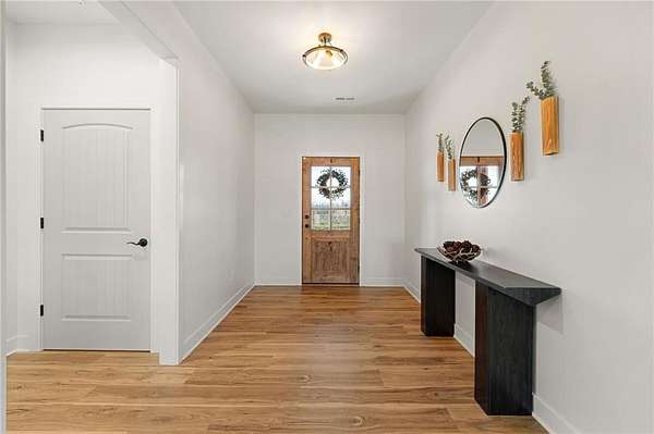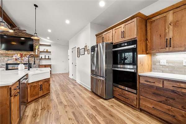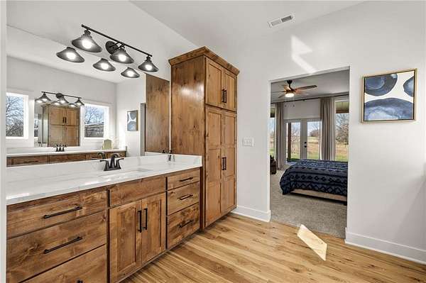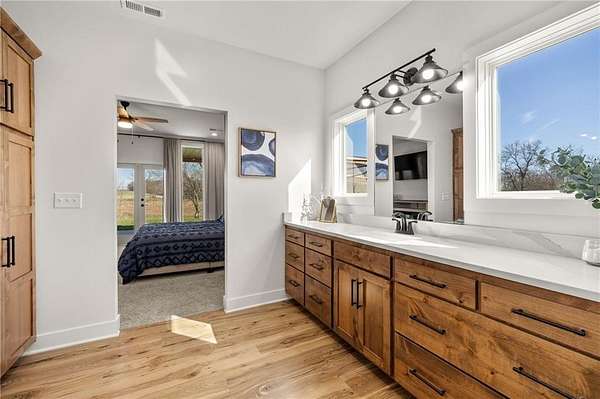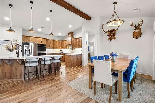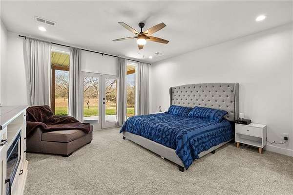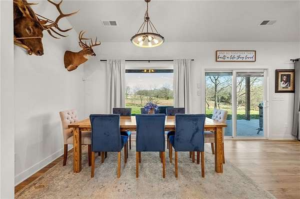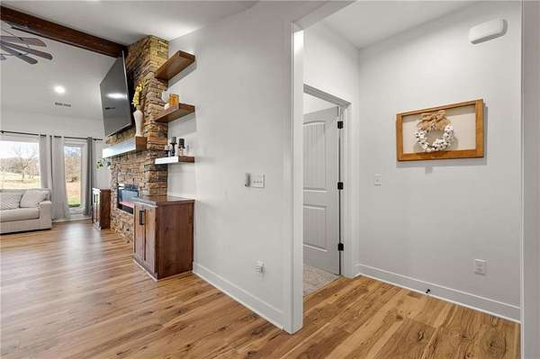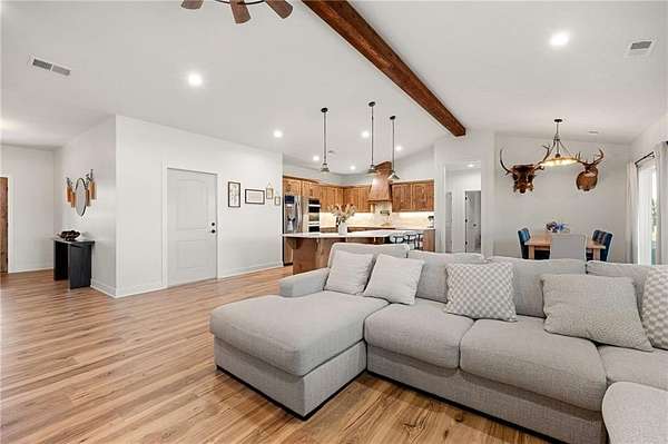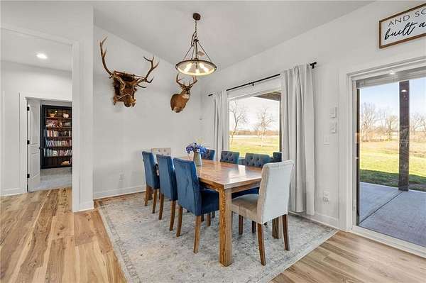 Custom-built and thoughtfully designed, this stunning home sits on 16.69 acres and offers the perfect balance of quality craftsmanship, functional living, and wide-open space. The difference is clear-this is not a builder-grade home, but one built with intention, comfort, and longevity in mind. The open-concept layout is filled with natural light, enhanced by large windows with energy-efficient tinting that provide both privacy and year-round comfort. Soaring 13-foot vaulted ceilings with exposed beams anchor the main living space, where a floor-to-ceiling stone fireplace and custom built-ins create a warm and inviting focal point. At the heart of the home, the kitchen is designed to gather. Custom cabinetry, a large center island, and double wall ovens make it equally suited for everyday living and entertaining. The walk-in pantry is also a certified safe room. The layout is both practical and flexible, offering four bedrooms-each with walk-in closets-and well-designed bathroom access for both privacy and convenience. The primary suite features a spacious walk-in closet and a beautifully finished bathroom with a large walk-in shower and dual shower heads. A Jack-and-Jill bathroom with separate sink areas and an additional bedroom with dual-access bath add to the home's smart design. Buyers will appreciate the oversized laundry room-complete with custom cabinetry, folding space, hanging storage, and a utility sink-designed to make everyday living easier. Built for efficiency and durability, the home includes heated concrete floors throughout, along with a standing seam metal roof and metal siding for long-term, low-maintenance living. The 16.69 acres offer space for recreation, outdoor living, hunting, or simply enjoying the privacy and peaceful surroundings-all while still being within convenient reach of nearby amenities. This is more than a home-it's a lifestyle property designed for comfort, function, and the way you want to live.