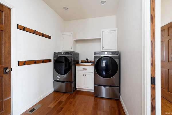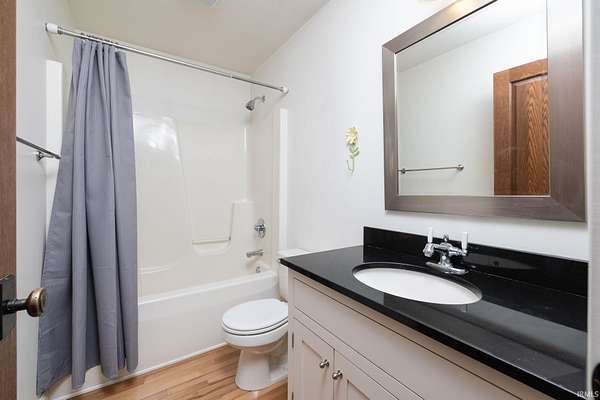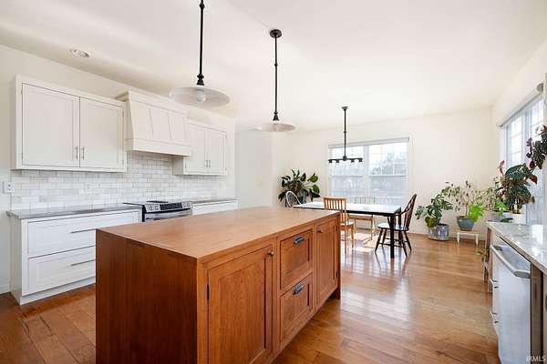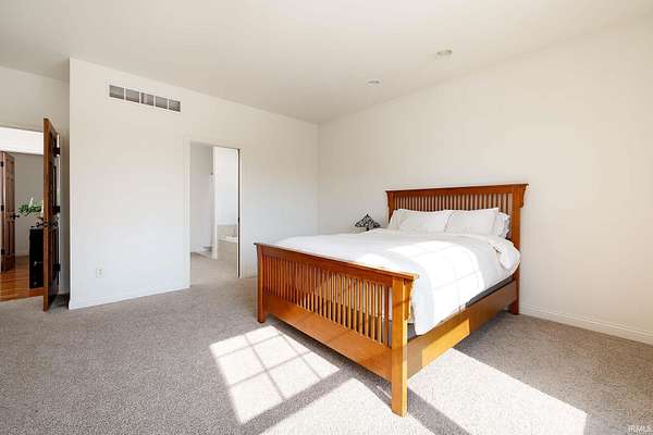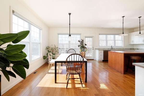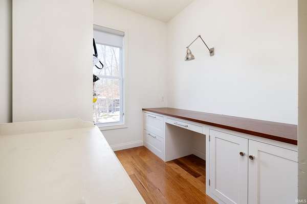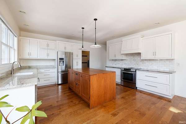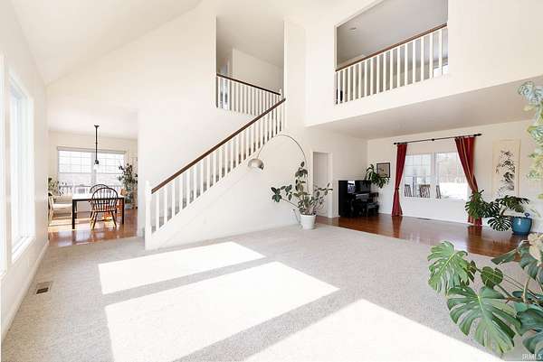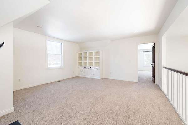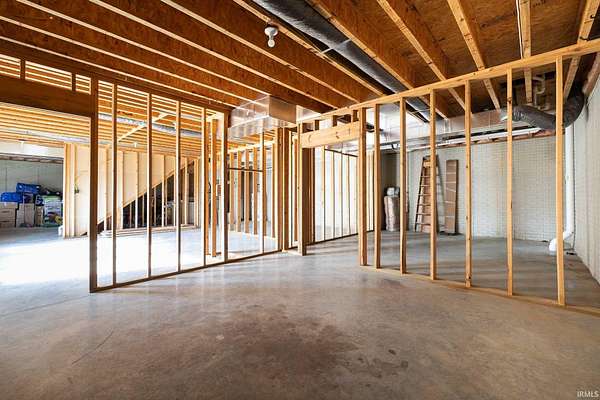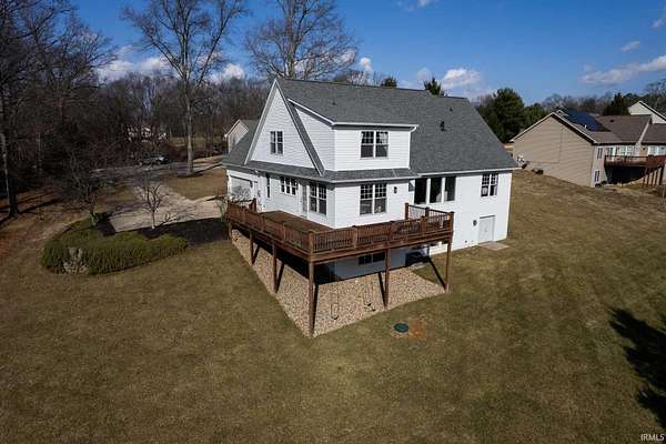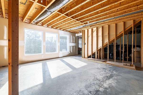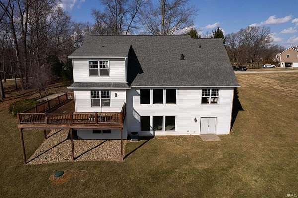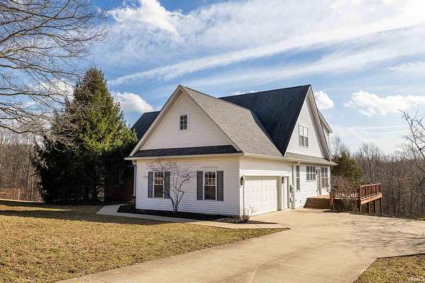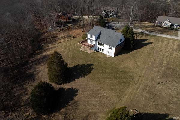 This Diane Smith/Irongate custom-built home sits on a private, partially wooded 1.95-acre lot and offers a thoughtful layout and substantial unfinished space for future expansion. The home includes approximately 3,000 finished square feet, plus an additional 1750 square feet in the walkout lower level. The main level features a spacious great room with 2-story vaulted ceilings a gas fireplace and large windows that frame views of the surrounding woods. The kitchen is designed for both everyday use and entertaining and includes white cabinetry, granite countertops, stainless steel appliances, and a beautiful wooden center island. Accessible from the kitchen is the large wraparound deck that overlooks mature trees and provides a peaceful outdoor setting. The primary bedroom is located on the main level and includes ensuite bathroom with double sink vanity, spa soaker tub and a large walk-in closet. Also on the main floor are a laundry room and a dedicated office space with built-in desk. Classic hardwood flooring and solid wood interior doors are found throughout the home. The upper level includes 3 additional bedrooms filled with natural light, along with a large loft space that works well as a media area, study, exercise room, play room or additional family room. One of the upstairs bedrooms has its own bathroom and walk-in closet, making it an ideal guest suite or private secondary primary bedroom. The walkout lower level is a major asset of this home and has great potential. It is already framed, has electrical in place, and includes rough-in plumbing for a large full bathroom. With high ceilings and large picture windows, the space feels open and bright and could easily accommodate a bedroom, office, family room, recreation room, utility room, workshop and generous storage. Enjoy a beautiful neighborhood setting while still having a lot of space and privacy. Only a 15 minute drive to Indiana University campus and an easy drive to shopping amenities and restaurants. See attached documents for additional info on unfinished basement. Seller is offering $25,000 concession to be used towards updating the deck and addressing windows with broken seals (or any repairs, rate buy down, credits, etc. preferred by buyer)