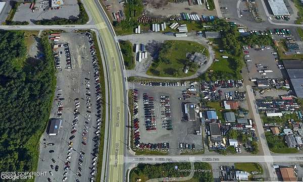 South on Old Seward Highway from the Dowling intersection. Property located on the east side of the street, adjacent to United Auto.