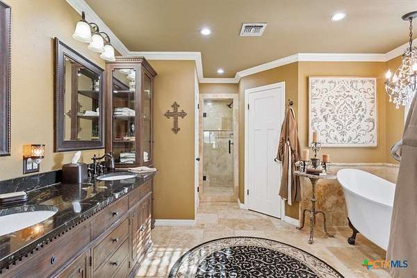 - All Bedrooms Down, Beamed Ceilings, Ceiling Fans, Crown Molding, Dining Area, Double Vanity, Entrance Foyer, Fireplace, Garden Tub Roman Tub, High Ceilings, Kitchen Dining Combo, Kitchen Island, Multiple Dining Areas, Separate Formal Dining Room, Separate Shower, Walk in Closets, Window Treatments