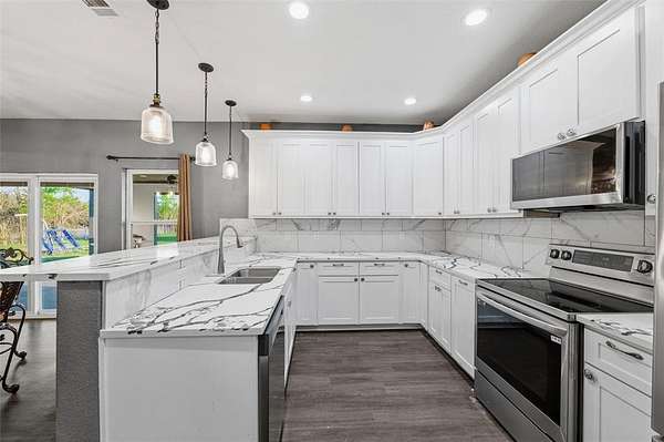 The main kitchen is built for both daily living and entertaining, featuring quartz countertops, stainless steel appliances, and a built-in microwave. Durable luxury vinyl plank flooring runs throughout the home.