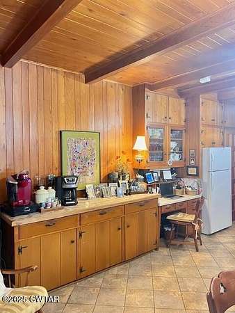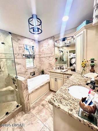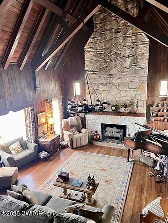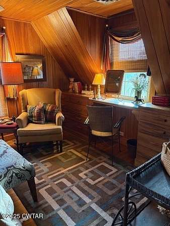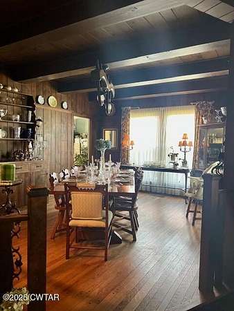 Our tudor style family home was built 75 years ago by our parents. Along with its steeply pitched roof lines, its exterior distinctive wooden timbers, and a beige tone limestone, the home's interior includes the same limestone that reaches from the hearth to the roof-high cathedral ceiling in the den. The den, dining room, and foyer are walled by a dark walnut-stain, tongue in groove, knotty pine. The flooring of all three, as well as the two downstairs bedrooms, hallway, and powder room, is pegged narrow-slat, oak hardwood. The kitchen flooring was tiled in 2019. The Master bathroom was fully remodeled in 2022. The landing upstairs (also pegged hardwood), overlooking the den, provides a sitting area. There are three upstairs bedrooms and a bathroom with shower. The downstairs and upstairs is 4003 sq ft. A carport and a two-car garage (currently a shop) adds 896 sq ft. A 40 ft x16 ft shop sits in the backyard. Our home is secured by an alarm system and security cameras.