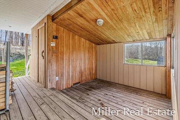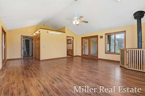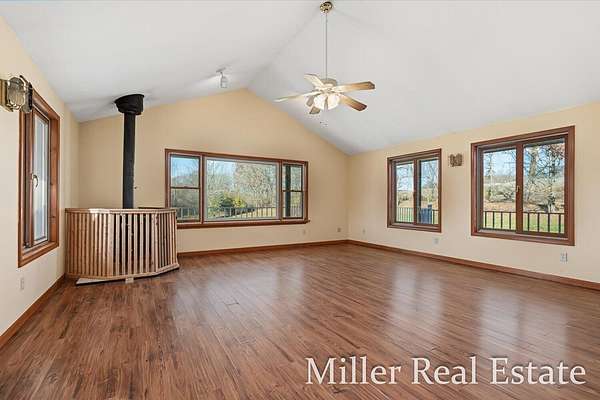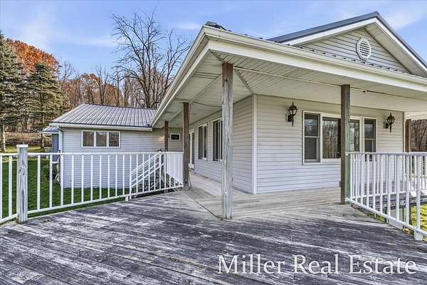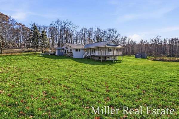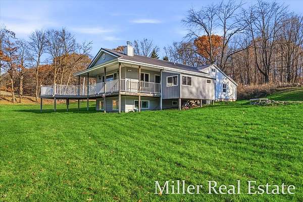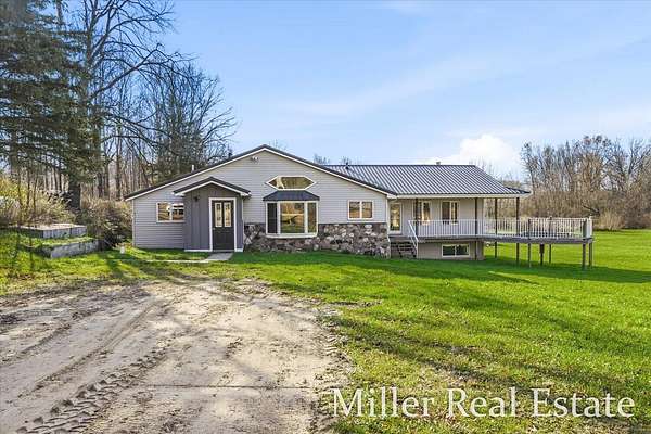 A spacious 4 BR, 2 Bath located minutes outside of Hastings on 2 acres. A mainly open lot surrounded by trees and Fall Creek running through the SW corner of the property. 15 minutes from Yankee Springs Recreational State land for hunting, hiking and boating. An open kitchen space with opportunities for updates, attached large dining space, main floor laundry, large living room with wood burner fire place and views of property. The decks surrounds the house on 3 sides and includes a sauna and space for hot tub. New well and pump in April of 2024 and steel roof in Nov 2024.