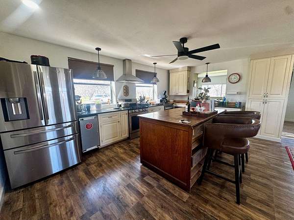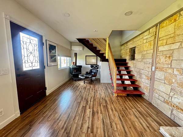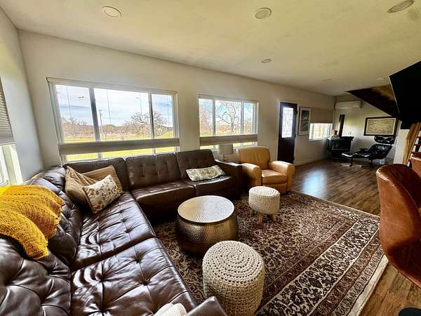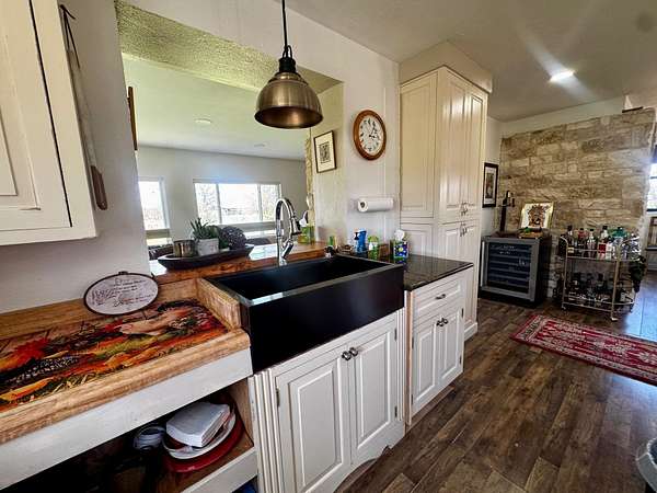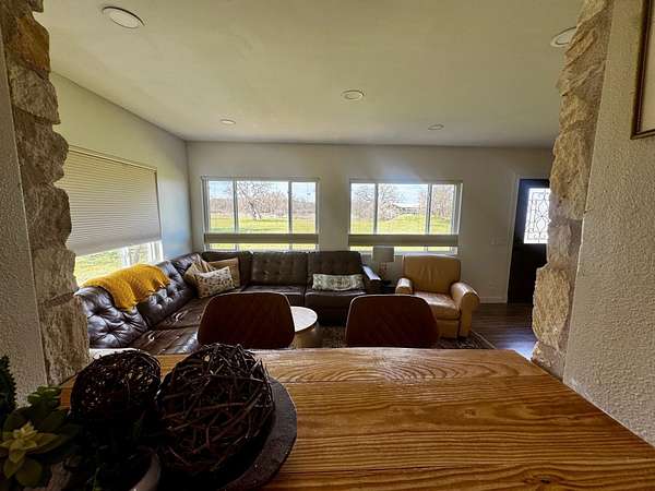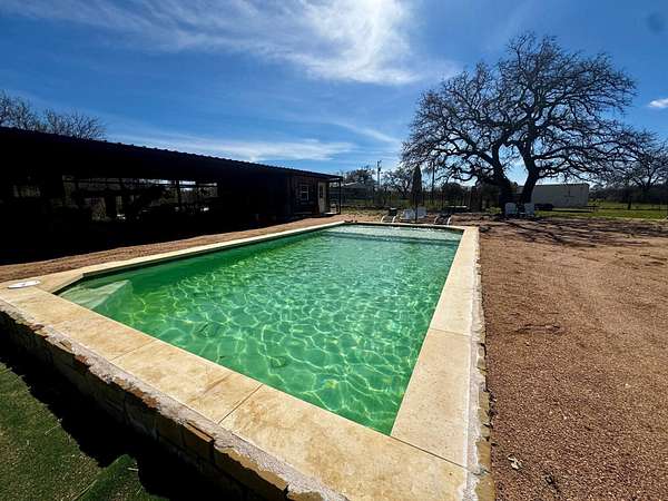 Escape to country living on this secluded 5-acre retreat, complete with a private in-ground pool and beautiful Hill Country views. This bright and inviting home offers 2 spacious bedrooms, 1.5 bathrooms, and an open layout filled with natural light. Inside, you'll find a versatile loft and additional space ideal for a home office. The property also features ample parking and a separate storage building with the potential to be converted into a guest house. Step outside and enjoy the peaceful setting, complete with an established high-fenced garden, room for livestock, and plenty of space to entertain or simply unwind. Exceptional water well producing a documented 50 GPM. Additional highlights include four energy-efficient mini-split units for heating and cooling, a 200-gallon propane tank for the cooking range, and a unique vintage kitchen island that adds character and charm. If you're looking for privacy, space, and a taste of farm life, this one-of-a-kind property is ready to welcome you home.
