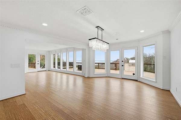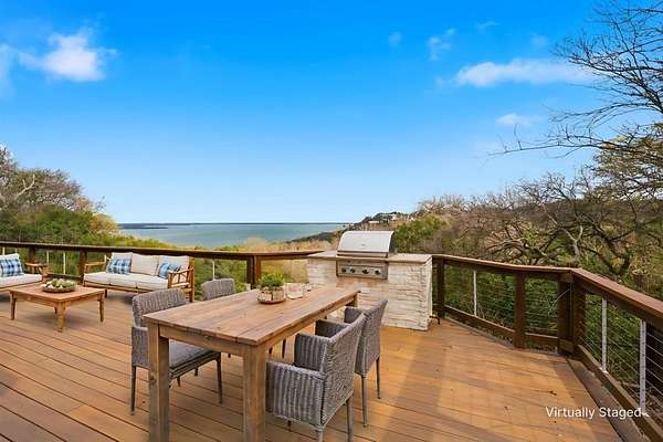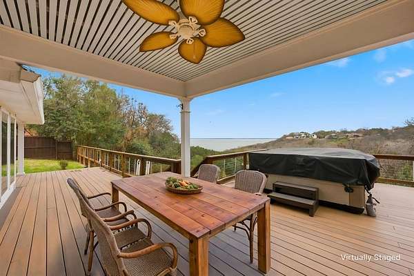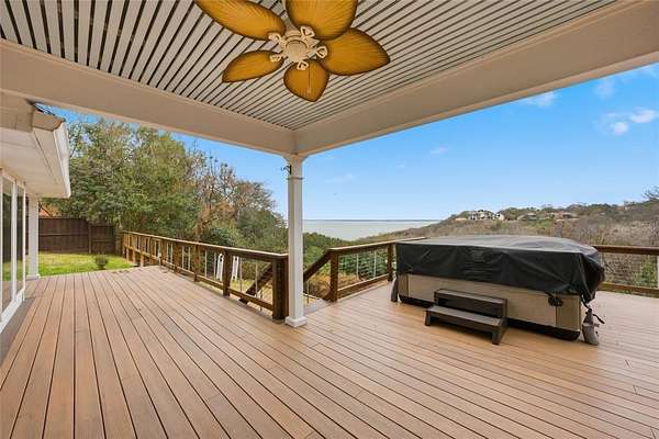 Extend your living space outdoors with an expansive deck that caters to the ultimate entertainment experience. Equipped with a grill and a fire pit, it's an ideal setting for hosting gatherings under the starlit Texas sky. For moments of sheer relaxation, the hot tub with its stunning lake view will become your personal haven.