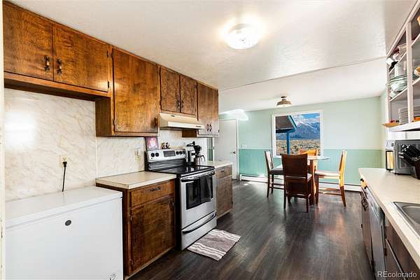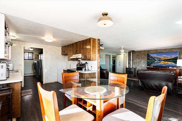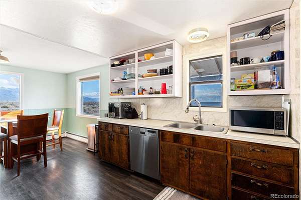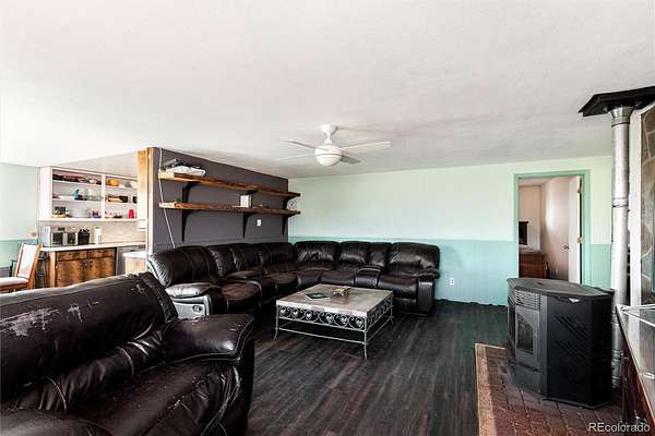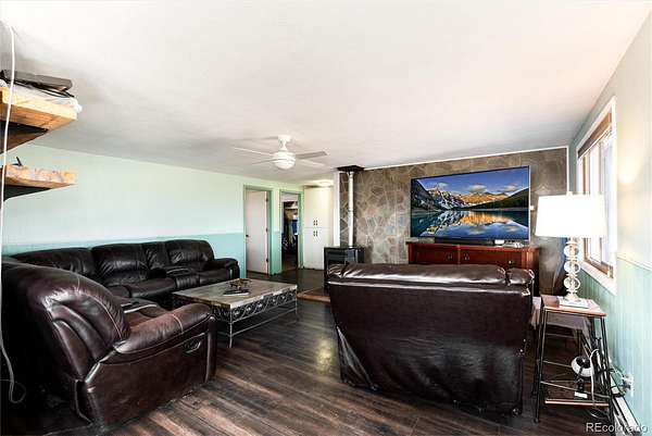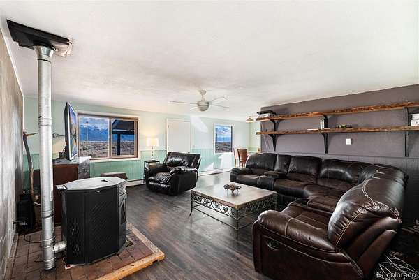 The 3-bedroom, 2-bath residence (1,381 SF) features durable 2x6 insulated construction designed for Colorado’s seasonal climate. Large windows bring natural light into the living areas while framing mountain and valley views. A pellet stove anchors the main living space during cooler months. Recent updates include new flooring in the kitchen, entry, and living areas. Roof replaced approximately six years ago.