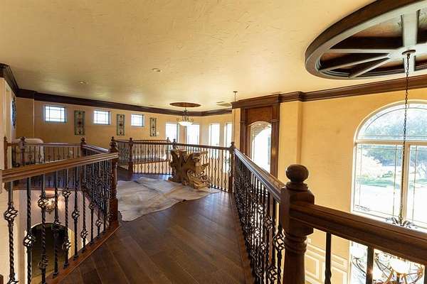 As you enter through the grand iron doors, you're welcomed into a striking foyer featuring cathedral ceilings, a stunning custom stairway, and a wine room to the right. To your left, a formal dining area showcases custom lighting, perfect for elegant entertaining. Overhead, a catwalk connects the upstairs bedrooms and playroom, giving the home a sense of architectural drama.