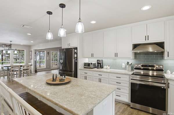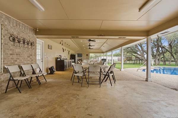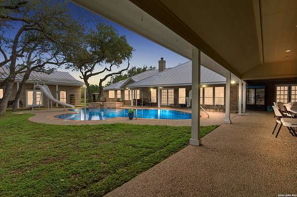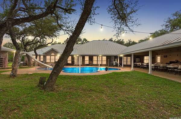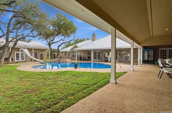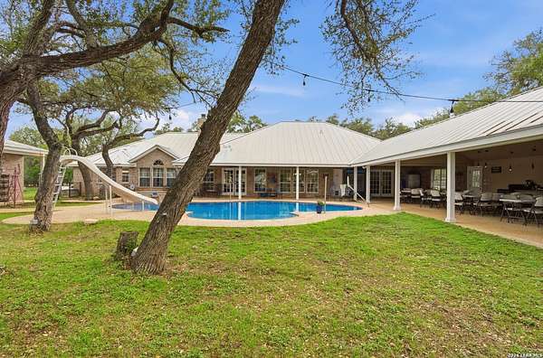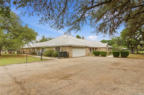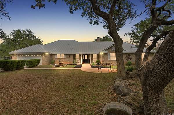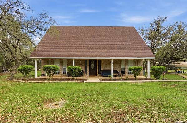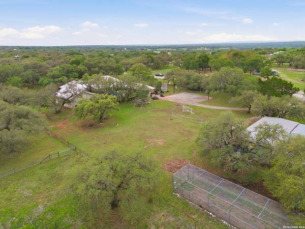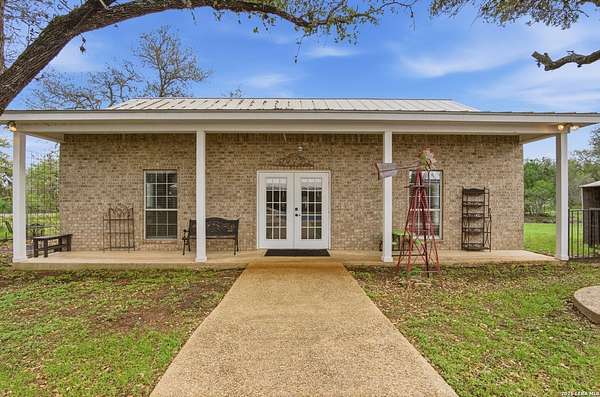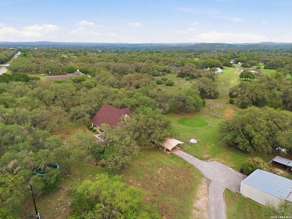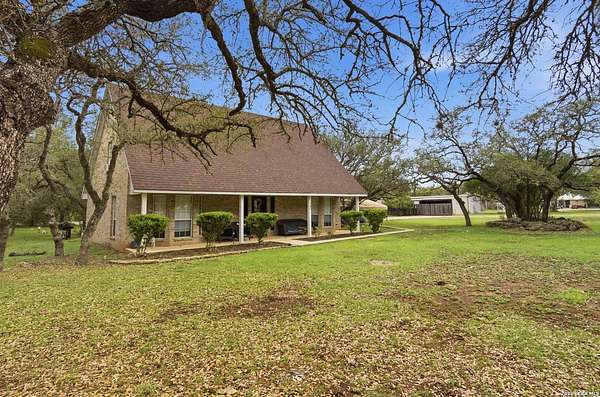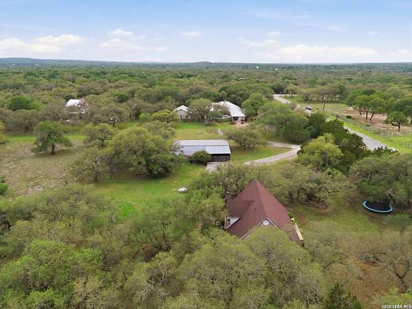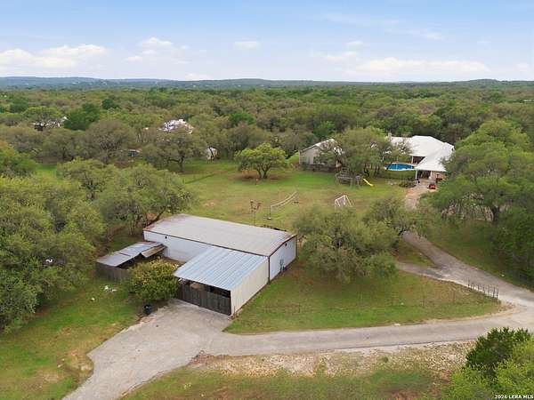 Tucked away on 5.23 scenic acres in Cypress Springs, this exceptional Hill Country property offers a rare opportunity with three separate dwellings, blending peaceful Hill Country living with unmatched flexibility. The main residence (approximately 2,845 sq ft) has been beautifully updated and features a spacious open-concept layout with a large living and dining area that flows seamlessly into the kitchen. The kitchen is equipped with custom cabinetry, an expansive center island and double ovens, making it ideal for both everyday living and entertaining. A cozy fireplace anchors the main living space, creating a warm and inviting atmosphere. French doors off the main living area open directly to the backyard and pool, creating a seamless indoor-outdoor connection. Off the garage, a versatile bonus room-currently used as an office-offers flexibility as a second living area, game room, guest space, or office. This space includes direct access to the backyard and pool area, along with a half bath that functions as a pass-through pool bath, with access from the flex room as well as a separate exterior door leading directly to the pool area. Outdoor living is a standout feature of the property, offering multiple covered patio areas, including a beautifully designed pavilion-style patio complete with an outdoor kitchen, ideal for entertaining and outdoor dining. The backyard retreat is complete with an in-ground pool and spa surrounded by mature trees, creating a private, resort-like setting ideal for relaxing or entertaining. In addition to the main home, the property includes a pool house and a separately gated secondary residence, offering exceptional versatility for multigenerational living, private quarters, or potential income-producing use. A major highlight of the property is the large metal workshop/storage building, providing substantial space for equipment, hobbies, storage, etc. Additional features include a metal roof, circular drive, generator and Guadalupe River access with the nearby neighborhood park. A rare opportunity to own a private Hill Country retreat defined by space, function, and a tranquil natural setting.