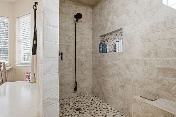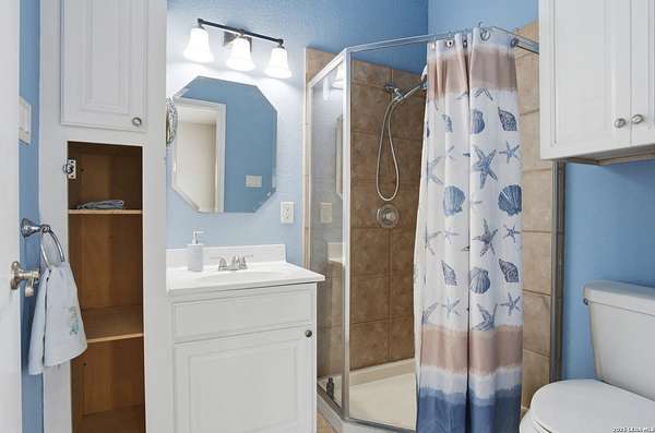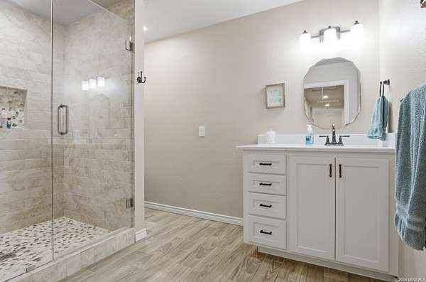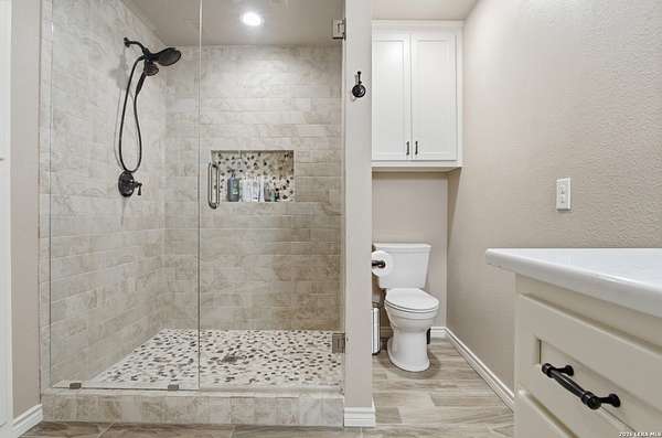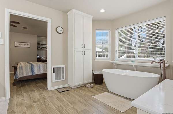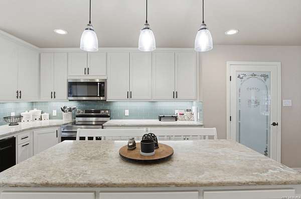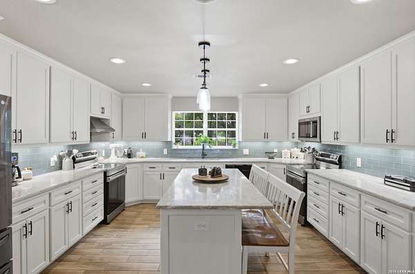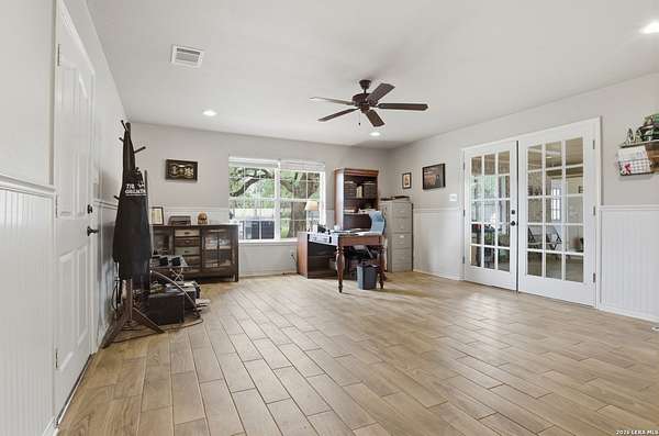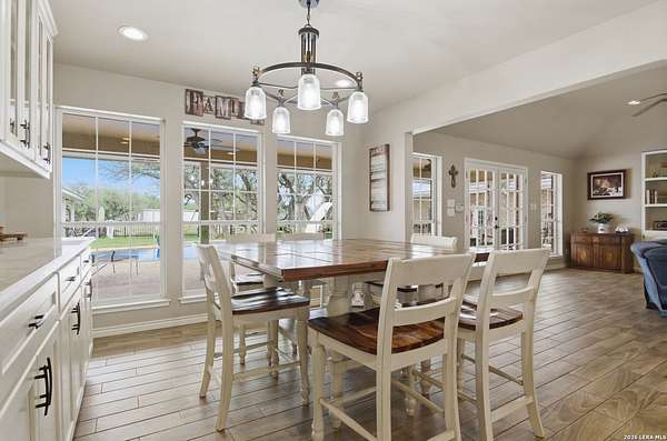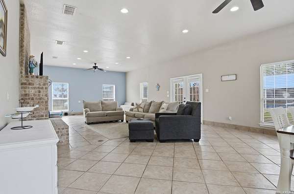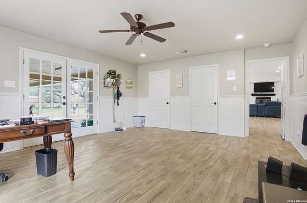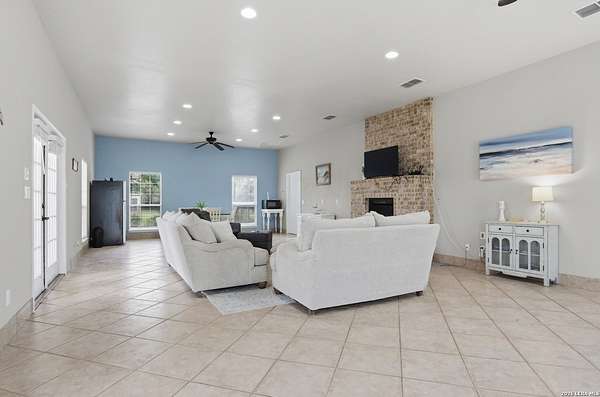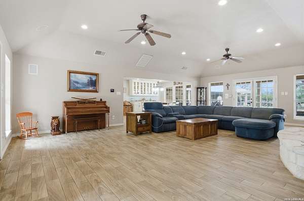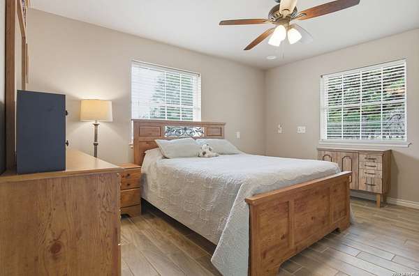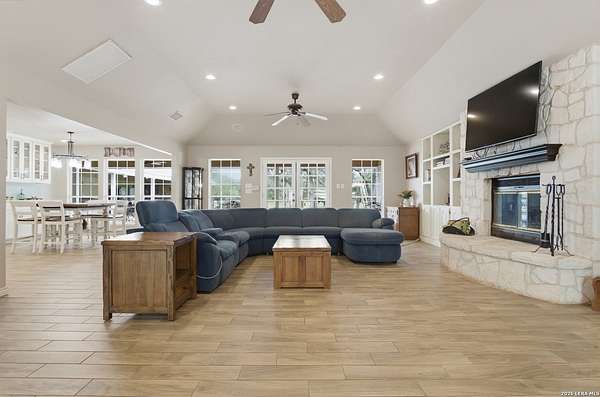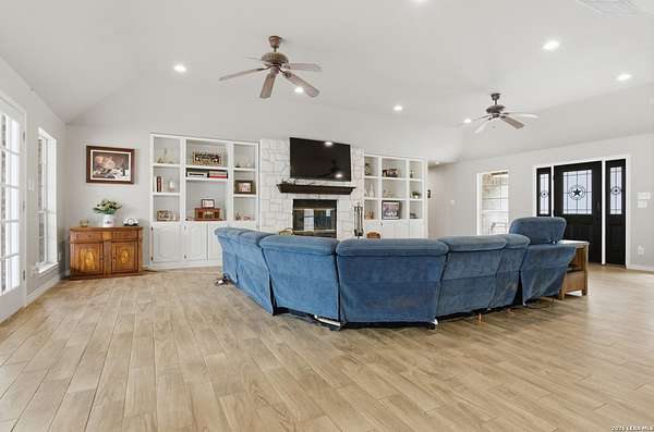 Tucked away on 5.23 scenic acres in Cypress Springs, this exceptional Hill Country property offers a rare opportunity with three separate dwellings, blending peaceful Hill Country living with unmatched flexibility. The main residence (approximately 2,845 sq ft) has been beautifully updated and features a spacious open-concept layout with a large living and dining area that flows seamlessly into the kitchen. The kitchen is equipped with custom cabinetry, an expansive center island and double ovens, making it ideal for both everyday living and entertaining. A cozy fireplace anchors the main living space, creating a warm and inviting atmosphere. French doors off the main living area open directly to the backyard and pool, creating a seamless indoor-outdoor connection. Off the garage, a versatile bonus room-currently used as an office-offers flexibility as a second living area, game room, guest space, or office. This space includes direct access to the backyard and pool area, along with a half bath that functions as a pass-through pool bath, with access from the flex room as well as a separate exterior door leading directly to the pool area. Outdoor living is a standout feature of the property, offering multiple covered patio areas, including a beautifully designed pavilion-style patio complete with an outdoor kitchen, ideal for entertaining and outdoor dining. The backyard retreat is complete with an in-ground pool and spa surrounded by mature trees, creating a private, resort-like setting ideal for relaxing or entertaining. In addition to the main home, the property includes a pool house and a separately gated secondary residence, offering exceptional versatility for multigenerational living, private quarters, or potential income-producing use. A major highlight of the property is the large metal workshop/storage building, providing substantial space for equipment, hobbies, storage, etc. Additional features include a metal roof, circular drive, generator and Guadalupe River access with the nearby neighborhood park. A rare opportunity to own a private Hill Country retreat defined by space, function, and a tranquil natural setting.
