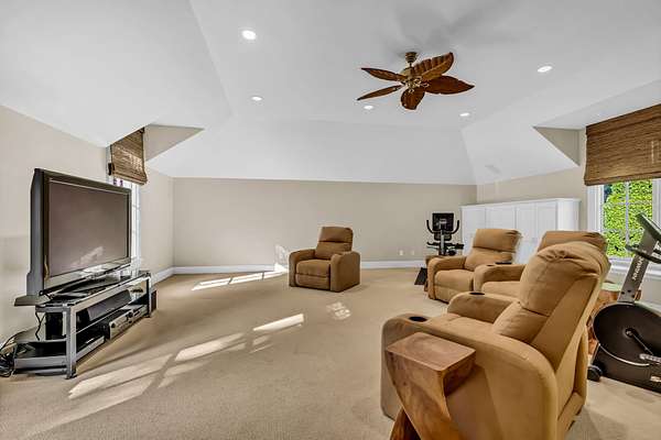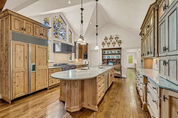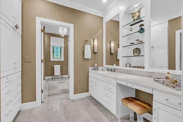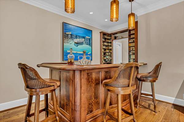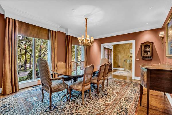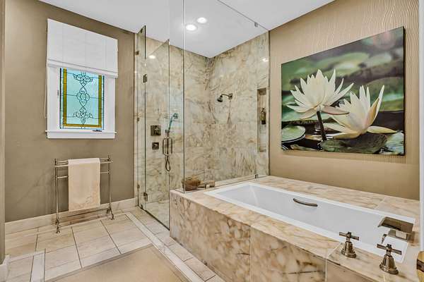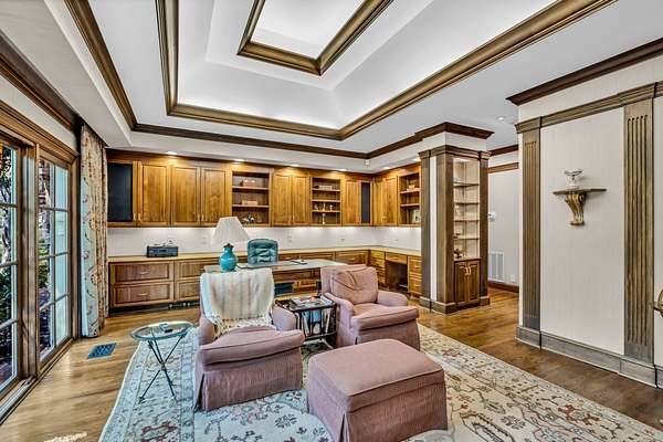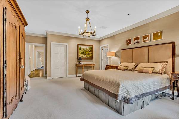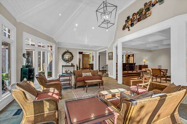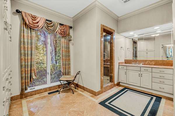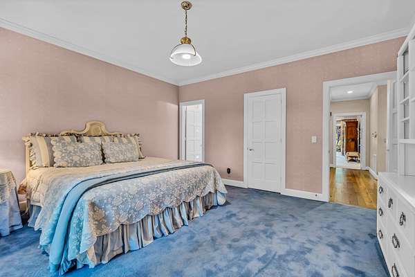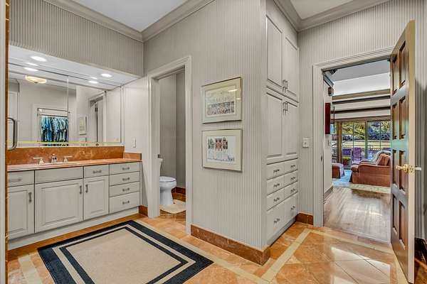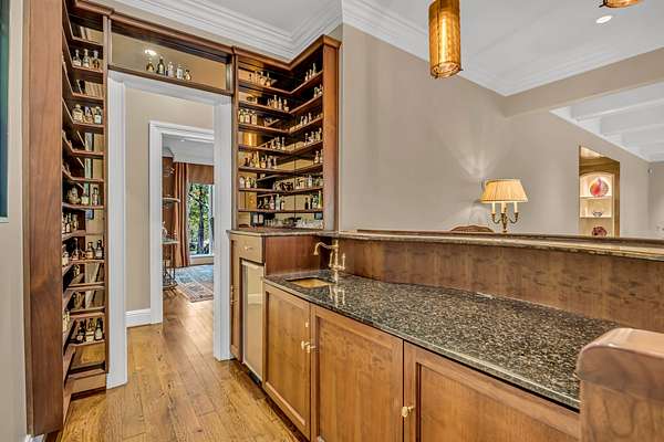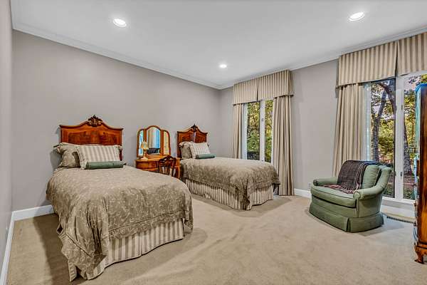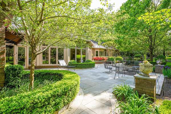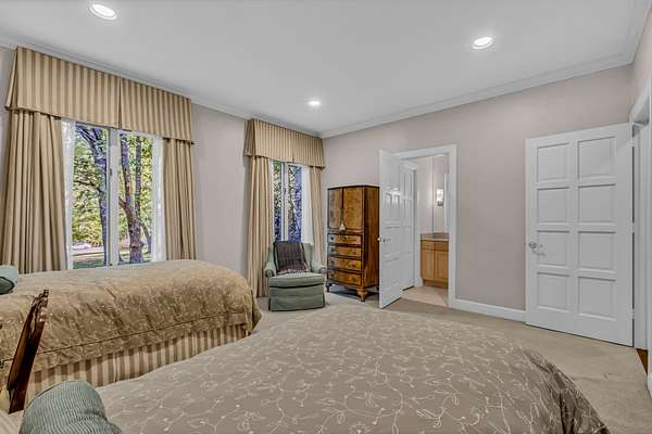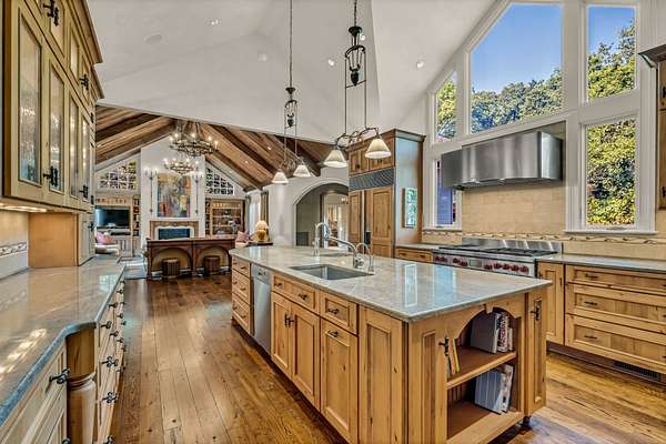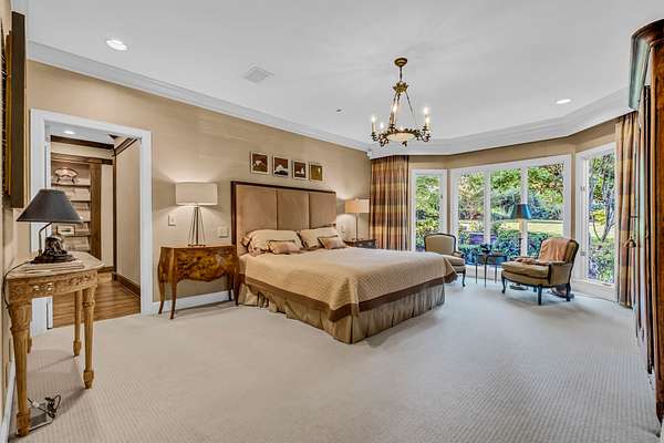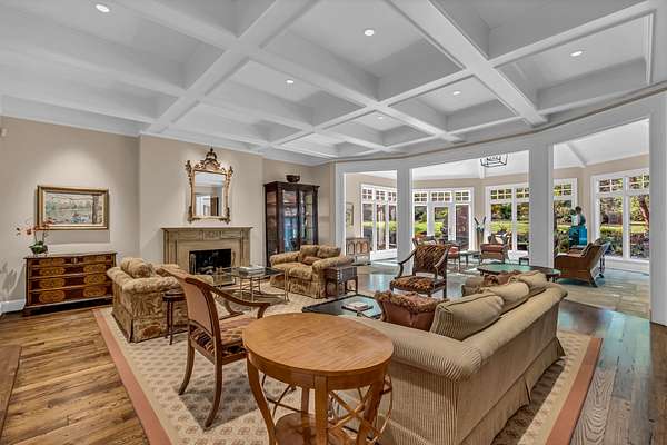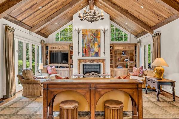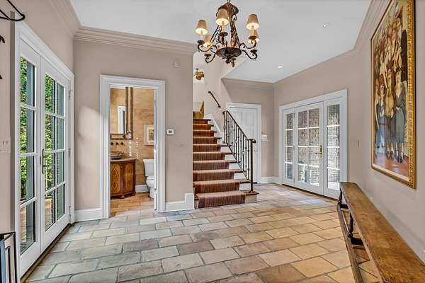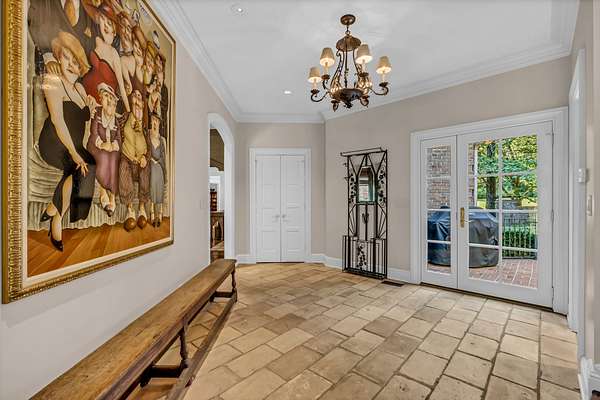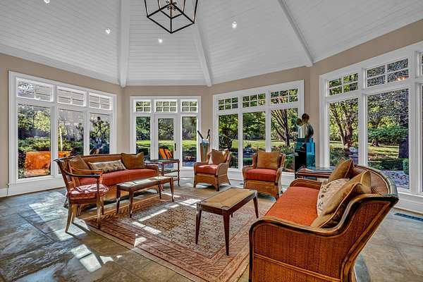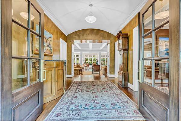 The grand entry provides a clear view through the formal living and sun room to the expansive grounds--ideal for a custom pool. The flow for entertaining large parties is ideal. Two oversized garages with separate entrances offer a total of four bays, plus a workshop and elevator access into the home. The private primary suite includes a dedicated study, dual full baths, and generous dual closets. Additional highlights include a custom bar, abundant walk-in storage, and three new HVAC units.