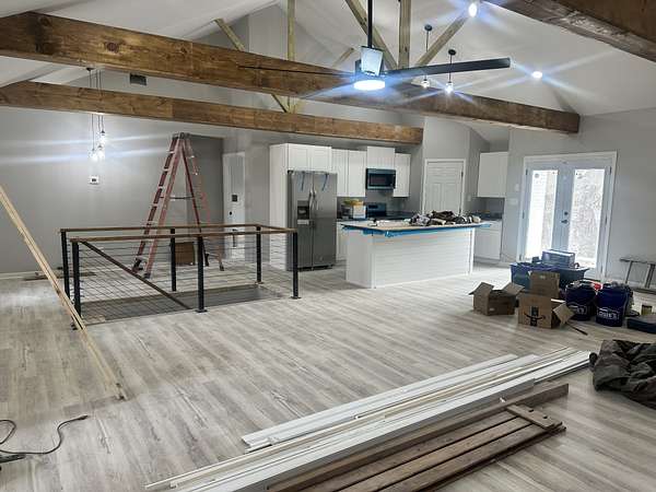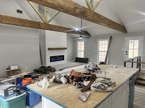 *HOUSE IS COMPLETED. DETACHED SHOP WILL BE COMPLETED BY 2/4. FINAL LANDSCAPING AROUND POOL TO BE DONE BY 2/6. MAIN IMAGE WAS BEFORE FRONT SIDEWALK WAS PUT IN. PROFESSIONAL PHOTOGRAPHY COMING SOON* | This fully renovated 4-bedroom, 3-bath luxury estate sits on 4.5 private acres just minutes from Clarksville and has been taken down to the studs with a completely new custom floor plan. The open-concept main living area features soaring ceilings with wrapped beams, LED recessed lighting, and an electric fireplace. The kitchen offers granite countertops, stainless steel appliances, a walk-in corner pantry, center island, and modern soft close cabinetry. A dedicated office with oversized windows fills the space with natural light and overlooks the in-ground pool. The main-level primary suite is a private retreat with its own electric fireplace and a spacious en-suite bath. The fully finished basement includes a large rec room with a third electric fireplace, trey ceiling, a bar-ready area with a full bar build-out available as an upgrade, and a built-in finished storm shelter for added peace of mind. Additional highlights include inground pool with brand new pool pump, new HVAC, new roof, new ductwork, new drywall, luxury vinyl plank flooring, tile, and soft modern carpet in select areas, a cedar-wrapped front porch, full concrete driveway, oversized 625 sqft attached 2-car garage, and a 720 sqft finished detached heated and cooled 2-car garage/shop with power. Every detail has been carefully curated for luxury, comfort, and privacy.