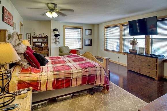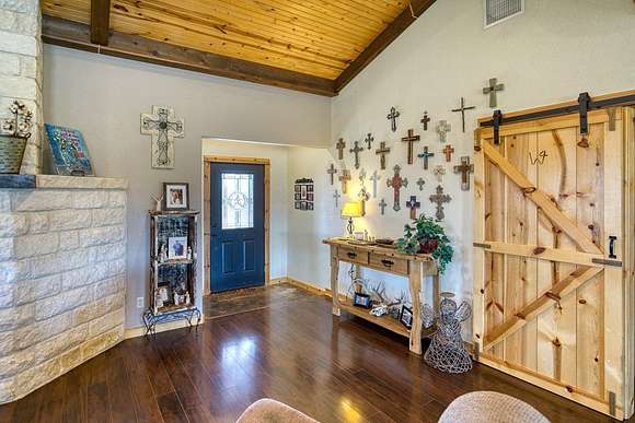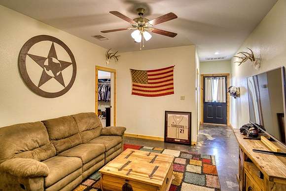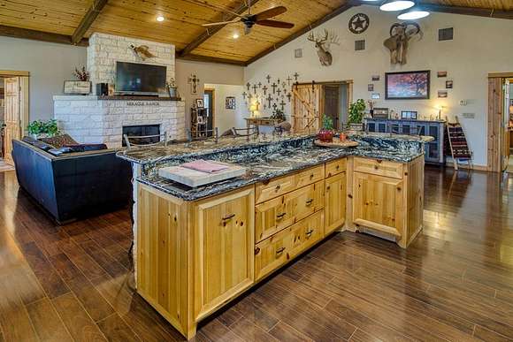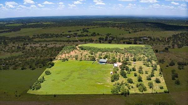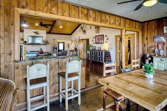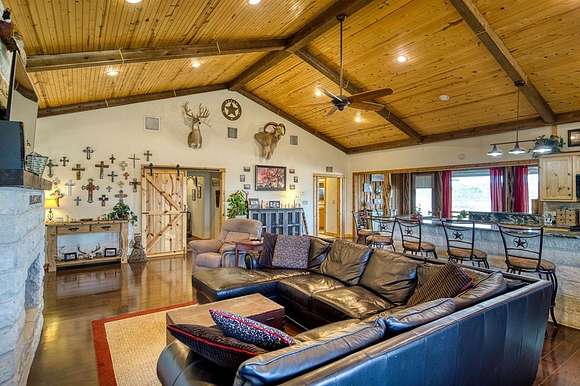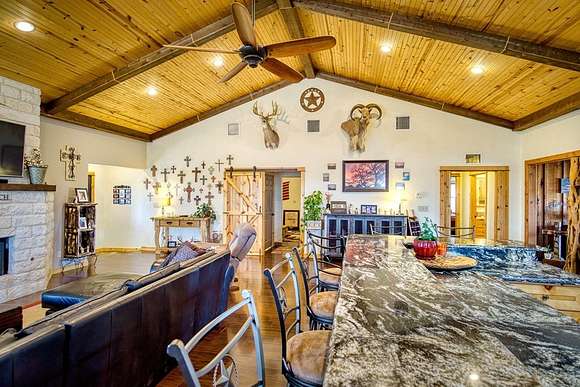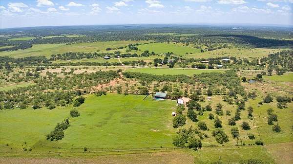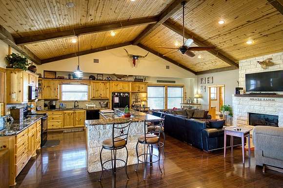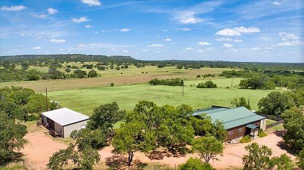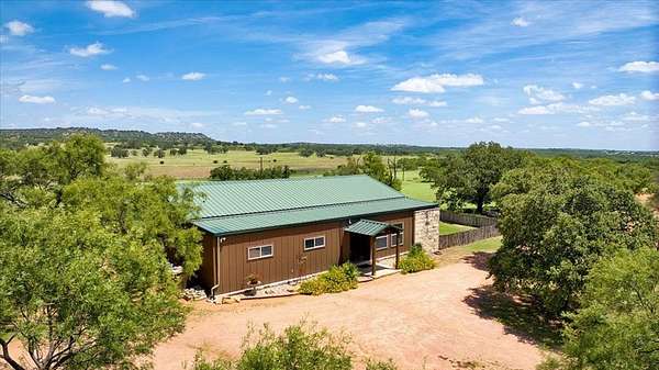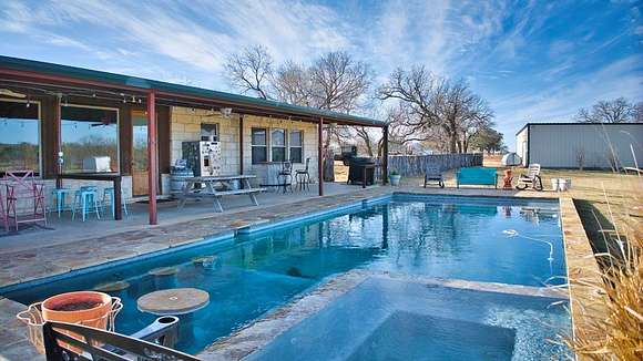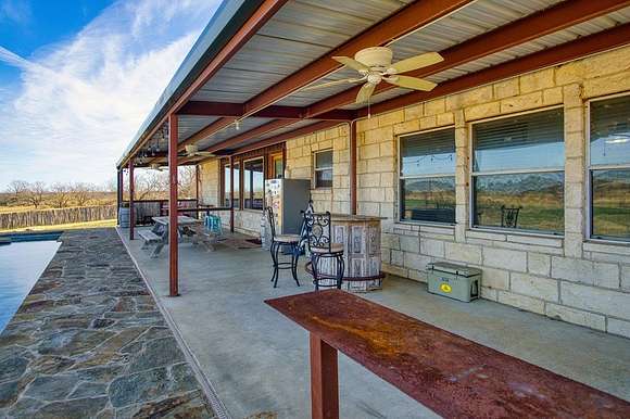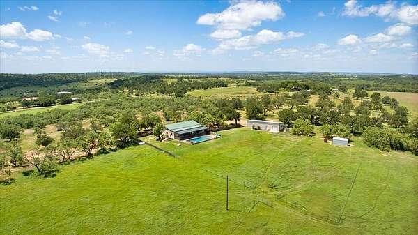 Property is located 7 miles north of downtown Mason, with convenient access from FM 386 and Blackjack Road. The 3,000 sq. ft. limestone home sits on the highest point of the property, offering panoramic views of the Mason Mountains. It has four bedrooms, three bathrooms, a cozy master suite with a library nook, and an open living area with a vaulted cedar-lined ceiling and a limestone gas fireplace. The kitchen features granite countertops, a large island with seating, and a formal dining area. Outside, an in-ground pool with a spa and spacious covered porch create a perfect setting for relaxing or entertaining. A 1,700 sq. ft. metal barn offers loft storage and three separate workrooms, one of which has removable metal pens for show animals. This barn is equipped with two roll-up doors, three 50-amp RV hookups, and pipe pens nearby. The land consists of about 10.5 acres of improved grass pastures, split into manageable traps for grazing, with an additional 5.42 acres in front of the house. Between these areas, brush, mesquite, and Live Oak trees provide both privacy and a thriving habitat for wildlife.