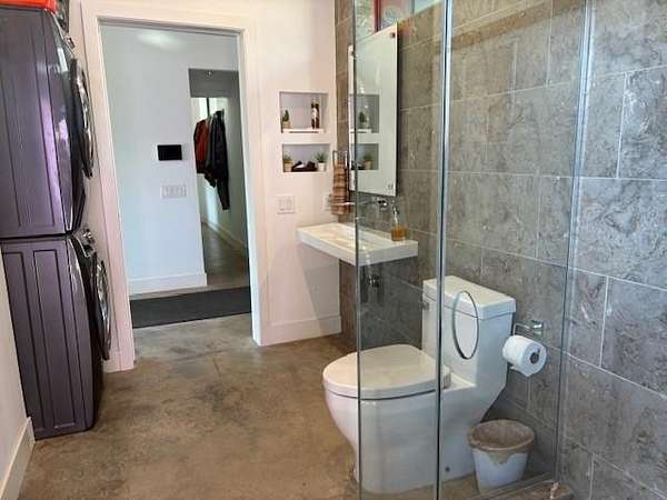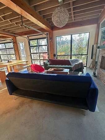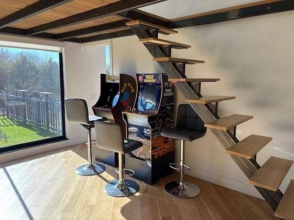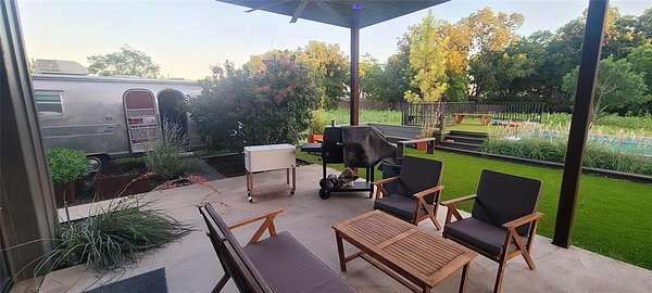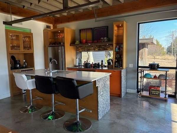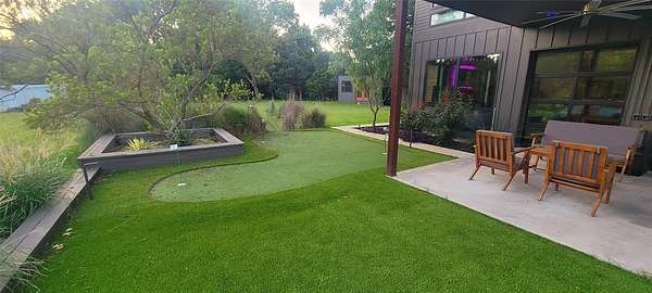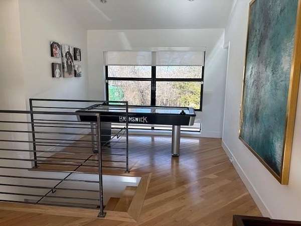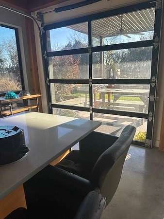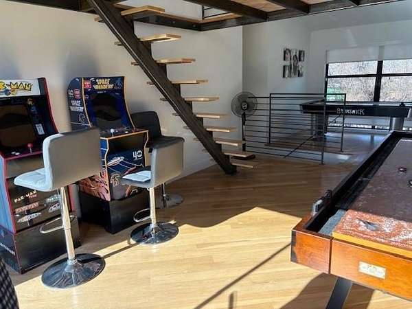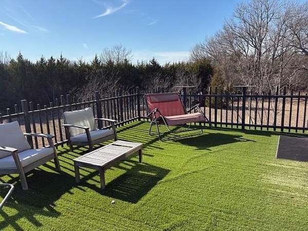Furnished home situated on three scenic acres just minutes from Lake Lavon. The main level offers an open-concept layout where the living room, dining area, and kitchen flow seamlessly together. Concrete floors and oversized overhead doors blur the line between indoor and outdoor living, creating an ideal space for effortless entertaining. Also on the first floor is a full bathroom with direct access to the pool area, a stackable washer and dryer, and a mudroom with built-in cabinetry and ample storage. The second level features two spacious primary suites, each with its own ensuite bath. A game room with video games and a third-level loft provide additional flexible living and recreation space. Outdoor amenities are designed for fun and relaxation, including an above-ground pool, firepit area, frisbee golf, putting green, basketball hoop, and a large covered patio perfect for gatherings.