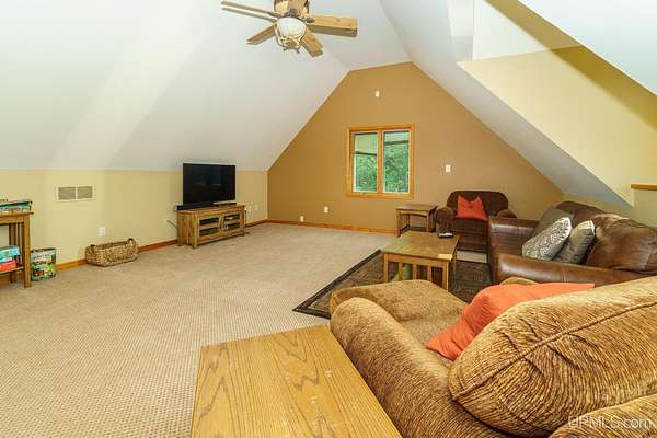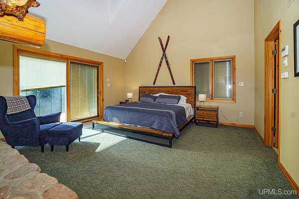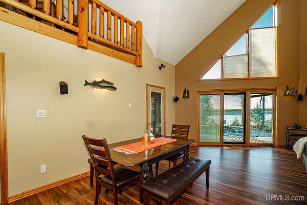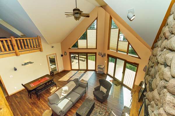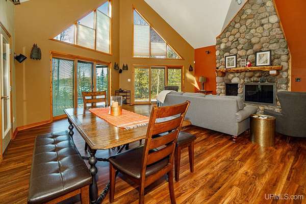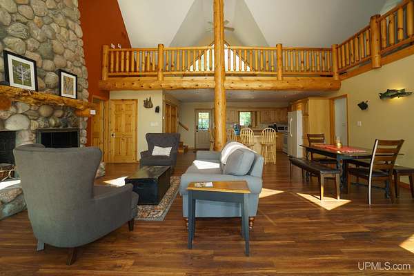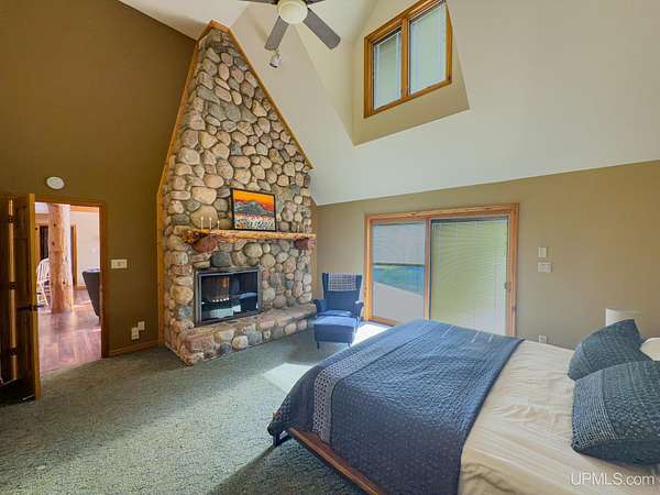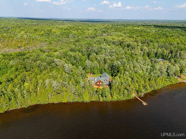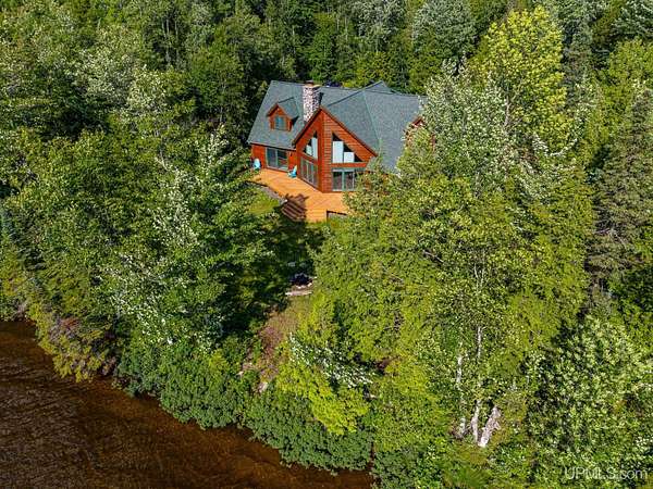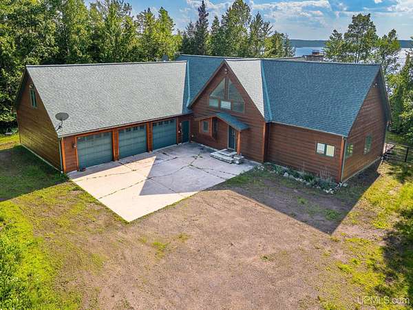 Experience refined Northwoods living in this stunning 3BR/2BA executive home on the shores of Chaney Lake, offering 253' of beautiful sand frontage and sweeping panoramic views. The expansive great room impresses with vaulted ceilings, cozy in-floor hydronic heat, a dramatic stone fireplace, and a wall of windows framing the lake. The open-concept layout features a generous island kitchen, spacious breezeway, and a massive loft overlooking the water. The luxurious primary suite includes its own fireplace and tranquil lake views, while two additional large bedrooms ensure comfort for family and guests. A heated 3-car garage and outdoor shed provide ample storage for vehicles and Northwoods gear. Impeccably maintained and thoughtfully designed, this retreat is perfectly located near area lakes, trails, and recreation. Whether relaxing in peace, entertaining in style, or snowmobiling right from your door, this property offers an exceptional blend of elegance, comfort, and natural beauty. BUYER TO VERIFY ALL MEASUREMENTS AND ZONING