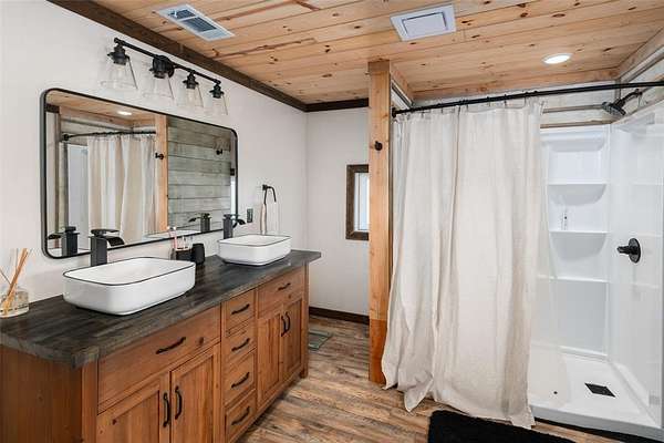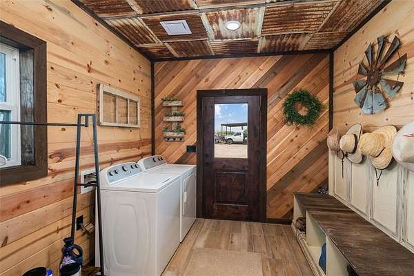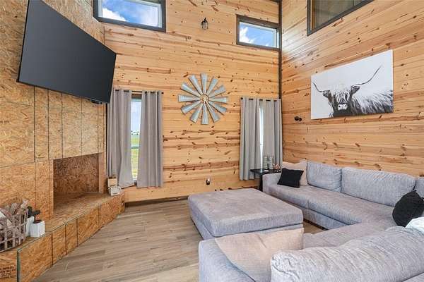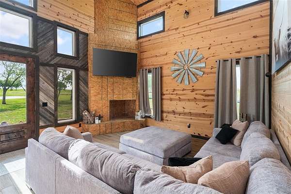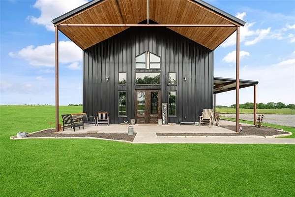 Experience peaceful country living on this breathtaking 12-acre North Texas property located in Leonard ISD, Fannin County. Expansive country views welcome you as a long, winding driveway carries you past two picturesque fishing tanks, beautiful pasture, & natural tree lines. As you pass through the final gate, you're greeted by a stunning two-story custom barndominium perfectly positioned to capture inspiring views of the land. The front porch features soaring pine ceilings, rich dark-gray metal siding that beautifully complements the warm wood tones & unforgettable custom windows. A spacious wraparound side porch extends to the back of the home, offering the perfect setting for entertaining, relaxing or simply taking in the unobstructed views. Inside, the open-concept design showcases cathedral ceilings, some wrapped in salvaged tin from the original barn built over 100 years ago. Vintage wood & tin are thoughtfully incorporated throughout the home as artistic design elements on walls and ceilings. The living area offers stunning views & features a decorative fireplace ready for your personal finishing touches. The space flows seamlessly into the casual dining area and a truly unforgettable kitchen with exceptional cabinetry & a large island. The spacious primary bedroom includes custom finishes and a private ensuite. An eye-catching staircase leads upstairs to two additional bedrooms, a full bath, & a fun hideaway loft. On the opposite side of the property, a 30x30 concrete slab is already in place, ready for a future shop. This one-of-a-kind property offers breathtaking land that is currently AG-exempt & ideally located within a few minutes drive to downtown Leonard. Enjoy the tranquility of country living with convenient access--approximately one hour north of Dallas and DFW Airport, minutes to shopping, and about 35 minutes to Melissa, home of the new H-E-B. A rare opportunity to own a unique blend of space, character, & convenience--this property is a must-see.
