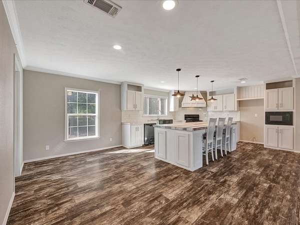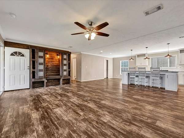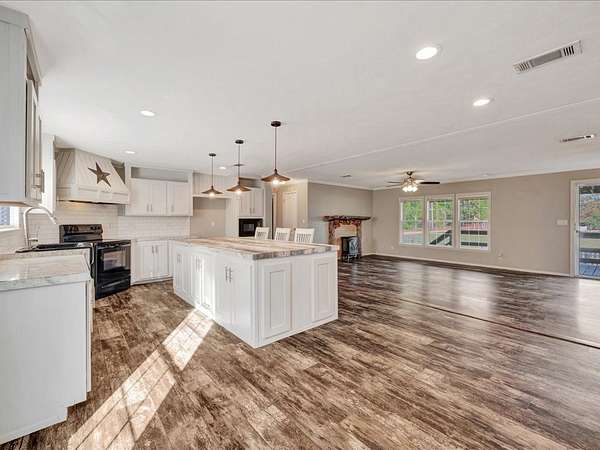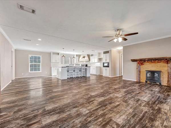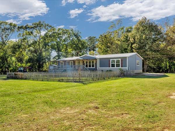 Enjoy peaceful country living in this beautiful 2019 double-wide home set on 3.81 scenic acres in sought-after Central ISD. With 4 bedrooms, 2 baths, and 2,112 sq. ft. of open living space, there's room for everyone to relax and unwind. The bright, airy floor plan features a spacious family room with an electric fireplace, a large kitchen with pantry, island and breakfast bar, and a welcoming dining area perfect for gatherings. The primary suite offers a private retreat with double sinks, soaking tub, separate shower, and three closets. Step outside onto the large covered front porch to enjoy the quiet setting -- complete with a small pond, fencing for livestock, and a charming picket fence around the yard. The acreage is ideal for kids, pets, or ag projects -- even a few chickens or a horse! Two RV hookups and an aerobic septic system add extra convenience. Also, an energy efficient home. A wonderful place to call home, combining modern comfort with the beauty of country life!
