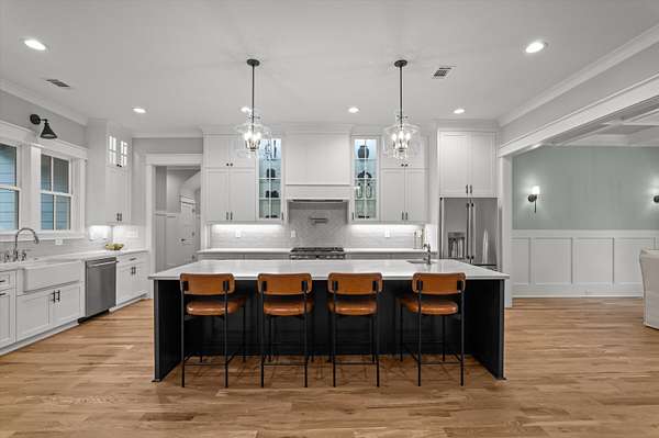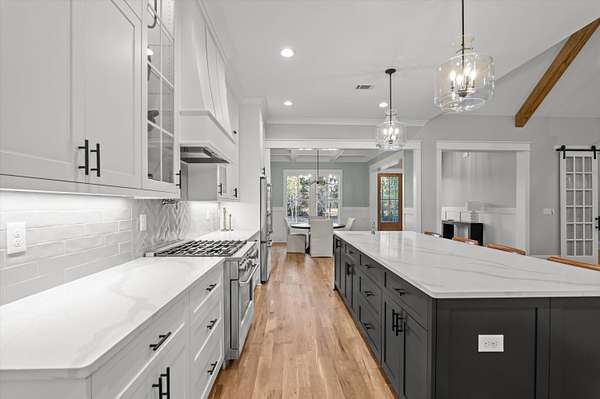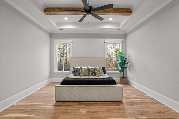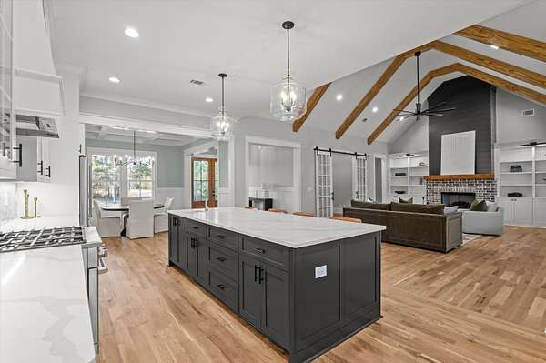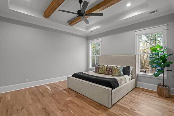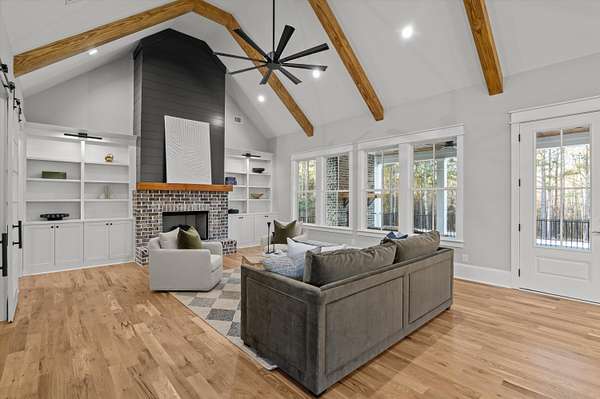 Amazing opportunity to purchase your dream property by Ironwood Custom Homes where luxury meets privacy convenient to life on the lake and only ten minutes from Publix and shopping at Riverwood! Nestled on 6.9 acres with no HOA, this home combines elegance, comfort, and timeless design. From the moment you arrive, the curb appeal impresses with cedar columns and tongue and groove ceilings on all porches. Immediately upon entry you are greeted with twelve foot ceilings and white oak flooring that flows seamlessly throughout the main level. The heart of the home is an open-concept kitchen and great room. The kitchen features an ten ft island with prep sink, custom cabinetry to the ceiling, stainless steel Cafe appliances, pot filler and gas range which is perfect for the home chef. The great room boasts dramatic cathedral ceilings with stained beams, a bricked gas fireplace, and a cedar mantel, creating a cozy yet refined atmosphere with an office nearby. The owner's suite is a true retreat with beautiful details in the ceiling, view of the property and features a custom tiled shower with glass doors, an oversized tub, and a spacious walk in closet that connects directly to the laundry room for added convenience. On the opposite side of the home, you'll find three private bedrooms with hardwood floors and each have an en suite bath with custom tiled showers. Upstairs, there's an additional bedroom and full bath, perfect for guest or a private office. Step outside to enjoy the ultimate outdoor living space with a covered rear porch, outdoor kitchen, gas fireplace with cedar mantel and a stunning gunite pool that is fenced in and ideal for entertaining or relaxing in your own backyard oasis. Enjoy the perfect balance of privacy and convenience, just minutes from Pollards Corner, public boat ramps yet tucked away in your own peaceful retreat!