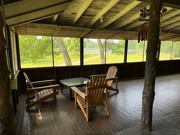 The 3,000 square foot lodge is nestled in the perfect spot overlooking Chenango Lake. The Lodge features a spectacular large, covered wrap-around screened in porch with beautiful lake views. The perfect spot to enjoy your morning cup of coffee with mother nature and watch the day come alive or enjoy the magnificent sunsets over Chenango Lake. The majestic two-sided indoor-outdoor stone fireplace can be enjoyed outside from the screened in porch area and also on the inside of the charming rustic lodge. This natural wood burning fireplace is a popular spot for guests to gather and relax with family and friends.
