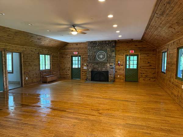 The Lodge also features an impressive dining hall and dining room with updated tongue and grove knotty pine siding on the walls to maintain that rustic appeal. Right off the dining room area is an updated commercial kitchen with all of the amenities to handle large family gatherings, corporate events, weddings, birthdays and many other events. The lower level of the Lodge makes for a great storage area.