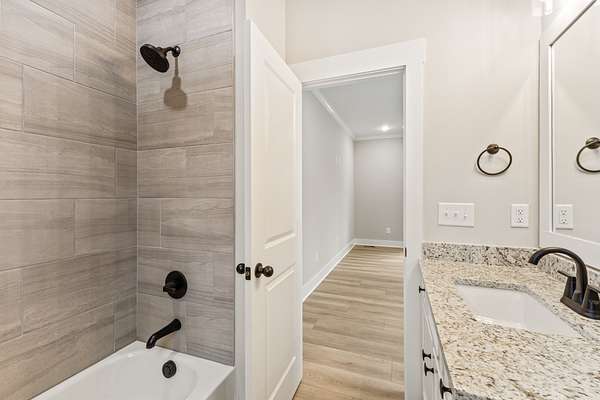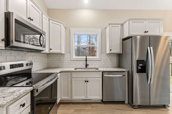 The kitchen is thoughtfully designed with wood-wrapped cabinetry, sleek granite countertops, and tile backsplashes, offering both durability and timeless appeal. Luxury vinyl plank (LVP) flooring runs throughout the home, combining style with low-maintenance living.