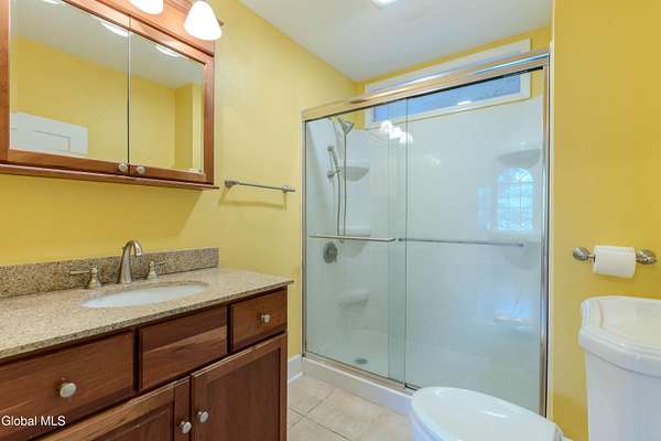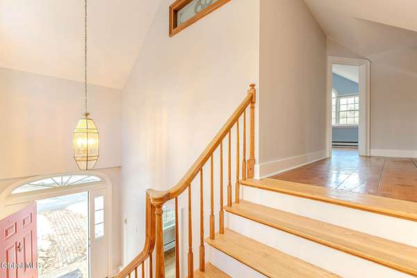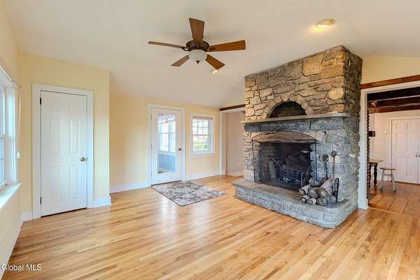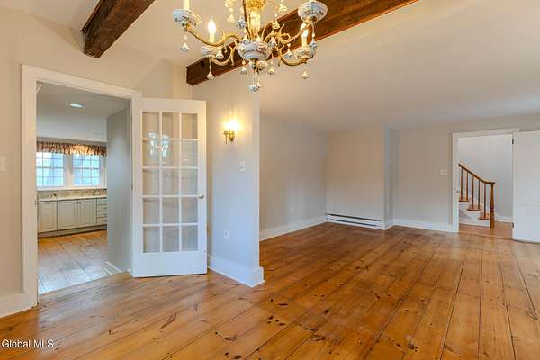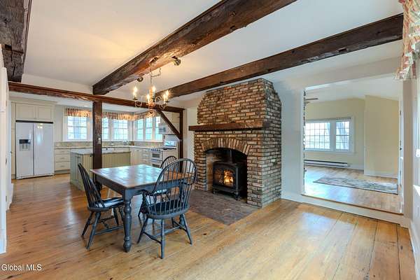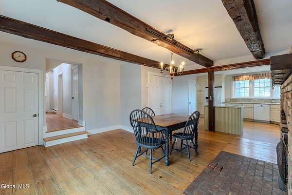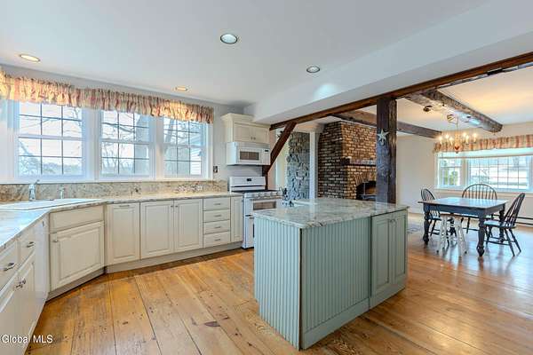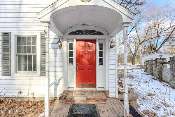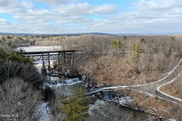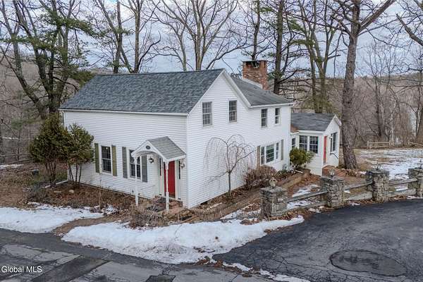 Set on 7.7 partially wooded acres high above the Normans Kill, this well-sited farmhouse enjoys dramatic views of French's Hollow Falls. It features a formal sitting room and dining room with original wood floors and exposed beams. The center of the first floor includes a fully renovated kitchen (2008 with more recent appliance replacements) with marble countertops, gas range with double ovens, and large windows that overlook the falls. An informal dining area and adjacent family room share an exposed chimney with two fireplaces (one wood-burning and the other a propane stove insert). The first floor also features a Mudroom and Laundry closet. Second-floor bedrooms also retain original wide-plank flooring. Primary enjoys ensuite bath and walk-in closet. With no through traffic, the property is quiet and secluded. The rear of the lot directly borders the Town of Guilderland Vosburgh Trails, providing immediate access to a 124-acre network of public lands and hiking trails. The lot is predominantly wooded, with bald eagles nesting nearby, and includes a basketball area, dog kennel, and a large detached two-car garage suitable for vehicles, storage, or workshop use. Located in the Guilderland CSD with convenient access to Altamont, Guilderland Center, Crossgates Mall, UAlbany, Albany, Thacher Park, the Helderbergs, Indian Ladder Farms, Altamont Fairgrounds, local orchards, wineries, Helderberg Rail Trail, golf, public library, and Guilderland YMCA. *OPEN HOUSE: Sunday 18 January from noon-2PM*