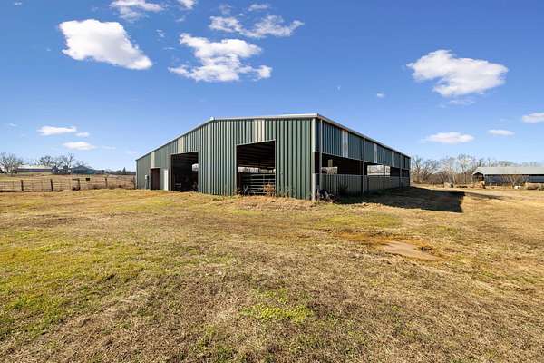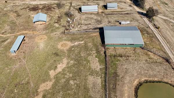 The land features established pasture, multiple ponds, and a live creek providing dependable water throughout the property. Quality perimeter and cross fencing, working pens, and a barn make livestock handling efficient and stress-free. A riding arena adds versatility for equine use, training, or recreation.