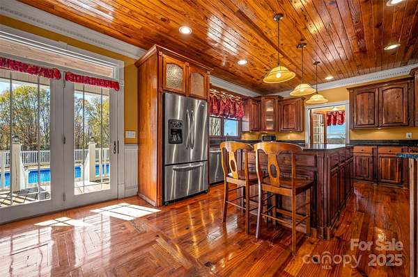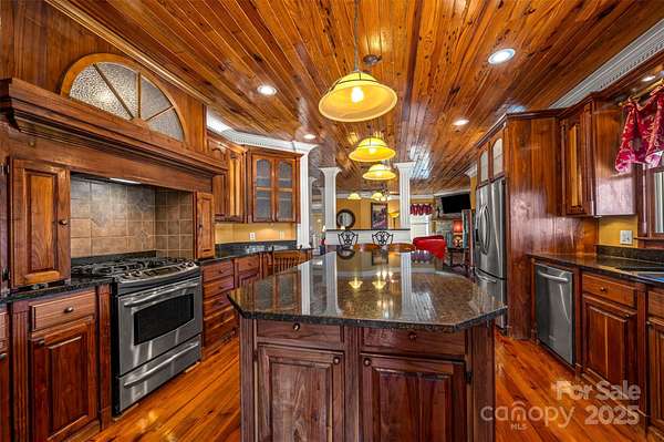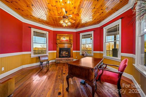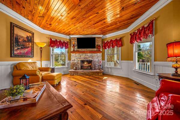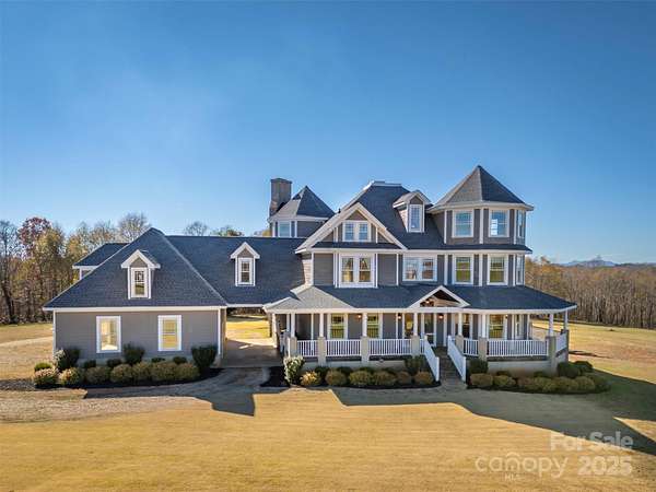 Prepare to be captivated by a residence where luxury, grandeur, and the majesty of the panoramic mountains converge. This castle-inspired custom estate rises from 10.25 unrestricted acres like a private kingdom, offering breathtaking mountain views and an atmosphere of pure serenity. What a perfect wedding venue or winery the property could be! With 4,859 square feet of exquisite living space-and a heated, unfinished basement and its own fireplace ready to be transformed into additional living quarters-this home is a rare masterpiece of craftsmanship and imagination. A newly installed roof ensures the estate's enduring beauty for years to come. Step inside and let the drama unfold with the vaulted view as you enter the home. A soaring great room welcomes you beneath pine ceilings, anchored by a towering stone fireplace and illuminated by natural light that pours in from every angle. The gourmet kitchen is a showpiece of custom cabinetry, generous island seating, and refined details designed for both culinary mastery and unforgettable gatherings. The formal dining room elevates every meal into a celebration, while a main-level study, piano room, or den offers a refined retreat for quiet moments or creative inspiration. Two luxurious primary suites-one on the main floor and one on the second floor-offer private sanctuaries, with the upper-level suite boasting its own stone fireplace, private deck with a view, and expansive his-and-hers closets. Two additional bedrooms, three versatile bonus rooms, and dual laundry rooms deliver unmatched convenience and flexibility for modern living. Throughout the home, every detail is intentional: dramatic ceilings, custom trim, premium finishes, and craftsmanship you can feel in every corner. Wide covered porches and multiple decks create sweeping vantage points for taking in the ever-changing canvas of mountain vistas. And outside... the magic continues. A sparkling pool, an enchanting gazebo, a wraparound front porch, multiple porches, a stone fireplace, and an expansive patio come together to create the ultimate backdrop for celebration, relaxation, or quiet reflection. With 10.25 unrestricted acres, the possibilities are boundless-build, expand, garden, explore, or craft the private homestead you've always imagined. It is 16 miles from the Tryon Equestrian Center. This is more than a home. It's an experience. A destination. A dream waiting to be lived.