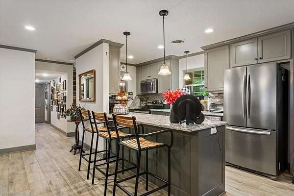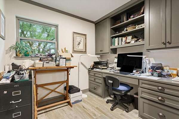 Inside, the inviting open floor plan connects the living, dining, and kitchen areas--ideal for everyday living and entertaining. The galley kitchen features granite countertops, stainless steel appliances, and ample storage. A cozy flex space offers the perfect reading nook or sitting room, while a dedicated office with built-in shelving makes working from home effortless. The spacious enclosed sunroom provides endless possibilities--crafting, workouts, hobbies, or relaxation.