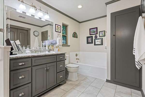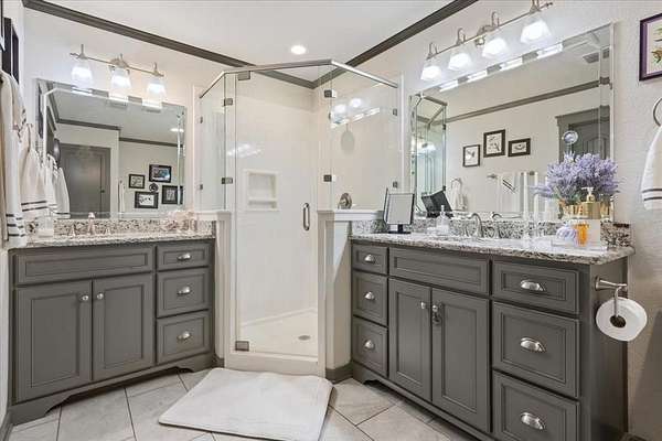 The downstairs primary suite includes a beautifully updated ensuite with dual sinks, a walk-in shower, and a newly resurfaced bathtub. Upstairs, you'll find two additional generously sized bedrooms and a refreshed bathroom.