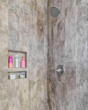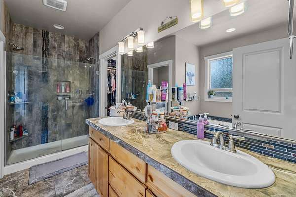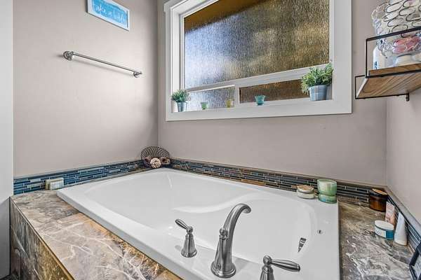 - Breakfast Bar, Ceiling Fan(s), Double Vanity, Granite Counters, Kitchen Island, Open Floorplan, Primary Downstairs, Shower/Tub Combo, Soaking Tub, Solid Surface Counters, Tile Shower, Vaulted Ceiling(s), Walk-In Closet(s), Wired For Sound