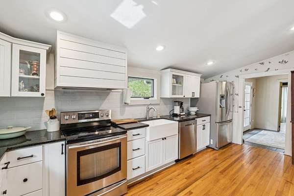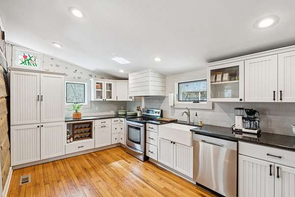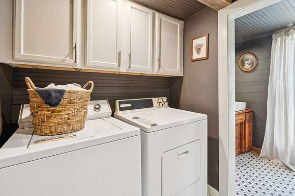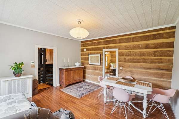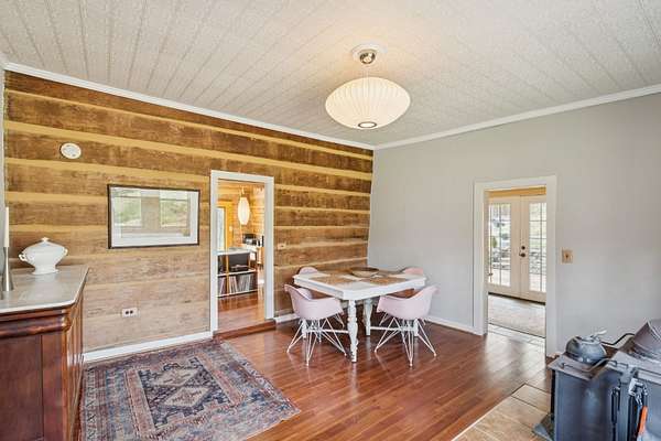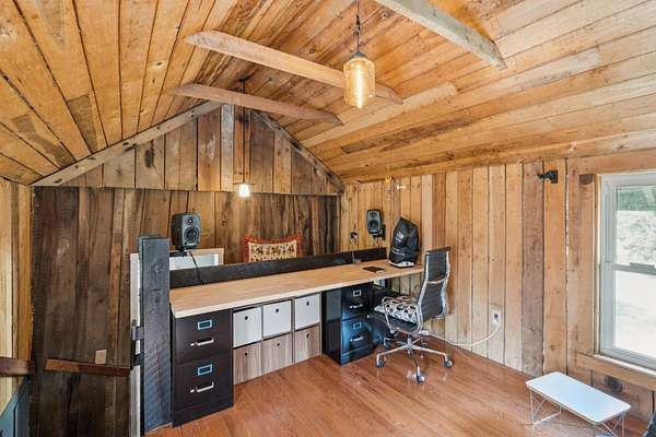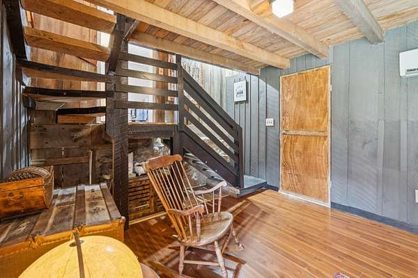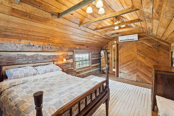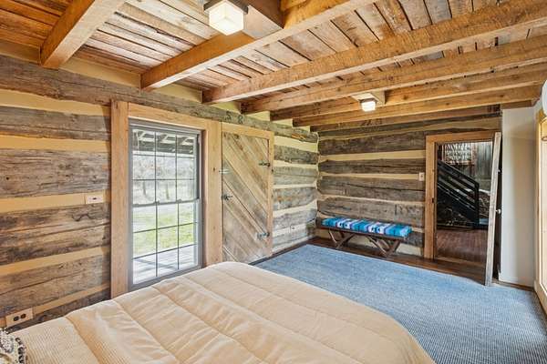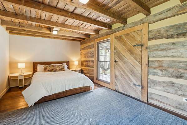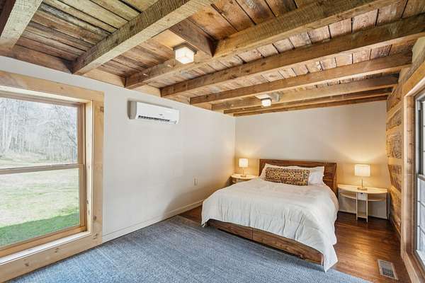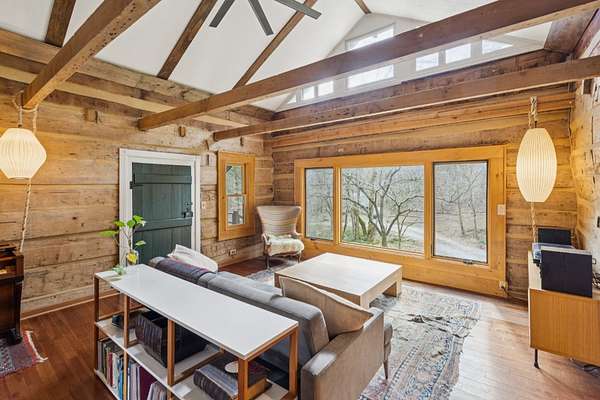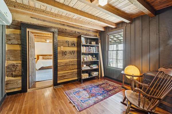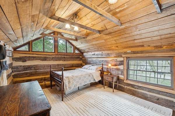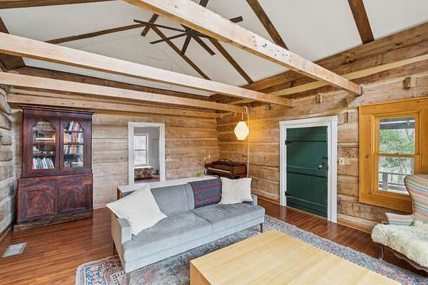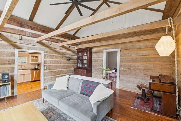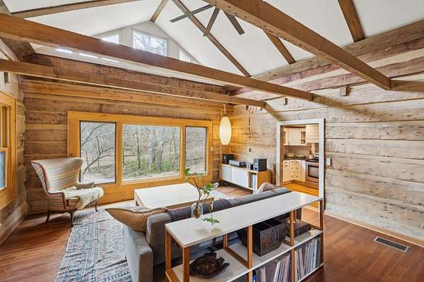 The home offers 1,781 square feet of living space with 2 bedrooms and 1 bathroom, featuring a spacious living room with vaulted ceilings, warm wood finishes, and abundant natural light that highlights the cabin’s rustic charm. A well-appointed kitchen with stainless steel appliances, a renovated bathroom and utility area, and updated fixtures throughout provide comfort while preserving the home’s historic character.