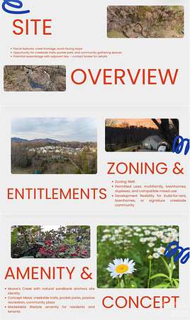 Positioned in the heart of Candler's growing corridor, this unique offering combines development potential with a rare natural amenity that can anchor a memorable community concept with RM6 zoning. Located near the expanding retail corridor and I-40 expansion, the property offers the location, access, and growth trajectory developers seek. What sets this site apart is the south-facing landscape and direct access to Moore's Creek featuring a natural sandbank "beach" area, a beautiful natural feature that inspires creek side trails, gathering space, a pocket park within a future community design. A nature setting minutes from everyday conveniences. The existing home includes numerous improvements and future expansion potential. The upper level (~900 SF) is already insulated with electrical rough-in, HVAC in place, and an open permit, making it easy to complete as additional living space. The property also features a new HVAC system (2023), new well pump, and water softener system. City water and sewer are nearby and can be available. This is an excellent development site, offering location, lifestyle, and long-term upside. Showings by appointment only. 24-hour notice required for interior home showings. Land tours may be accommodated with 1-hour notice. Potential buyer pool includes townhome developers, build-for-rent operators, multigenerational family estate seekers, and small infill developers seeking a signature creek side project. Possible for sober living community or residential treatment housing, buyer to confirm. Potential assemblage with adjacent site, contact listing broker for details or tours. Quick access to Smokey Park Hwy and I-40 with new ramp coming in nearby. Minutes to Downtown Asheville and the Blue Ridge Parkway. Due diligence materials available upon request.