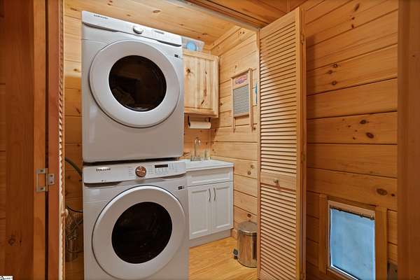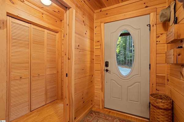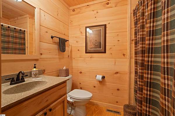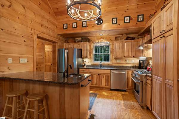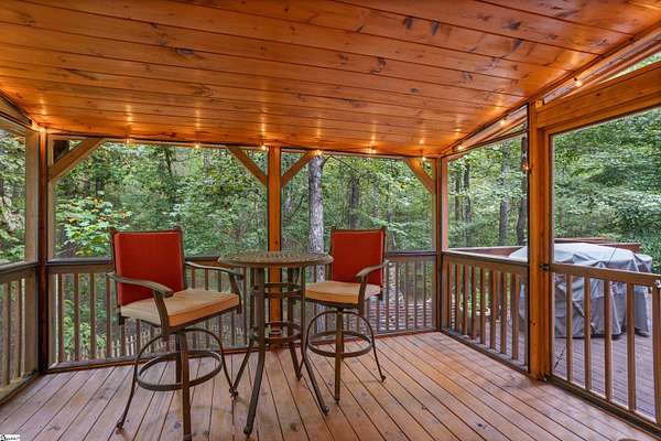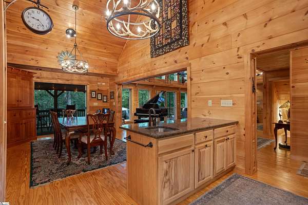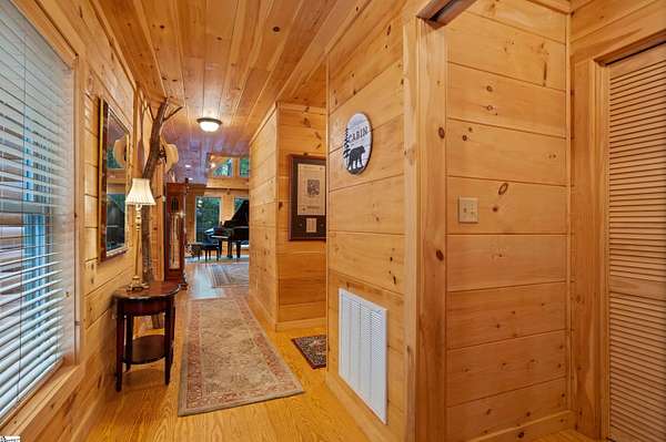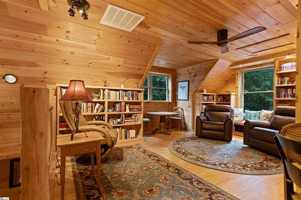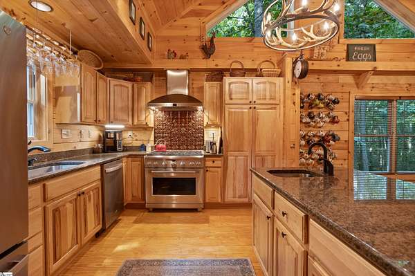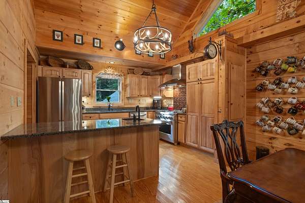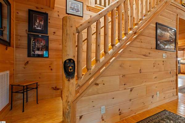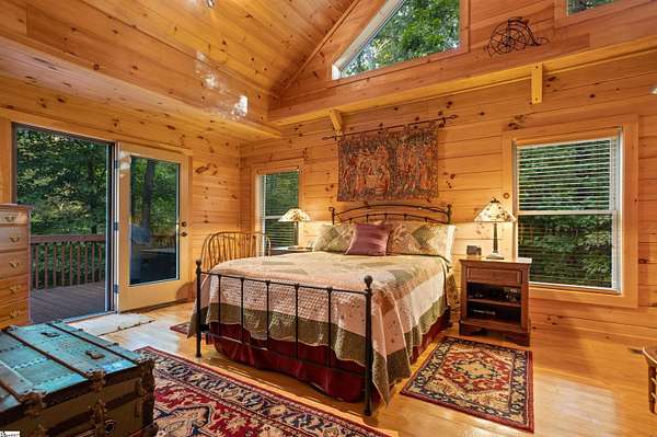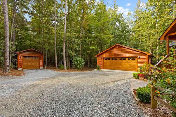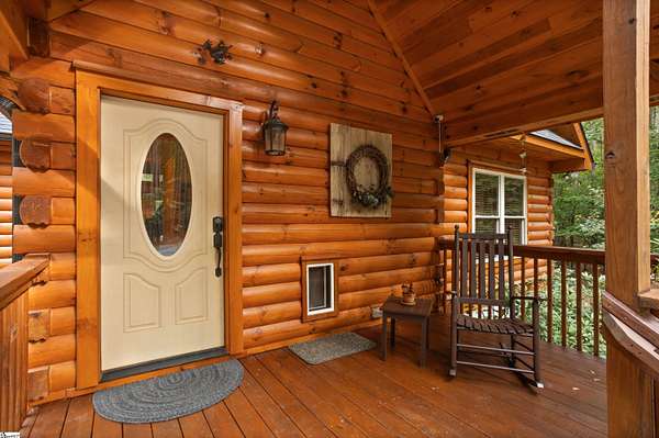 Your Private Log Home Retreat Awaits! Tucked away at the end of a private drive, this stunning custom-built 1.5-story log home with a full basement offers the perfect blend of rustic charm and modern convenience. With 3 bedrooms and 3 baths, every detail has been thoughtfully designed to create a warm and inviting retreat. The soaring 23+ foot ceilings with exposed beams, gleaming hardwood floors, wall-to-wall windows, and a cozy Jotul gas stove make the great room the heart of the home. The chef's kitchen features a 6-burner gas range, hickory cabinets, granite countertops, breakfast bar, and spacious dining area that flows seamlessly onto the screened porch--perfect for entertaining with wooded views as your backdrop. The main-level owner's suite offers a peaceful escape with a jetted tub, separate shower, double vanity, and walk-in closet with custom shelving. A guest bedroom and full bath complete the main floor. Upstairs, a loft with built-ins and another full bath offers versatility as a bedroom, office, or lounge. The finished basement is designed for fun and flexibility, boasting a theater room with Dolby Atmos sound system and furniture included, plus an additional room ideal for a gym, hobby space, or playroom. The remainder of the basement provides incredible storage and is already stubbed for an additional bathroom. Outdoors, enjoy a lifestyle that's truly special--relax on the screened porch, host pizza nights at the brick oven and pergola, or gather around the firepit under the stars. A 2-car detached garage and 1-car detached garage add convenience, while CAT 6 wiring throughout the home ensures working from home is seamless. This property combines privacy and accessibility--just minutes to Inman and Boiling Springs, with easy access to Asheville, Hendersonville, Greenville/Spartanburg, and both GSP and Asheville airports within 30 minutes. Located only a mile across the SC state line, this is truly a rare find!