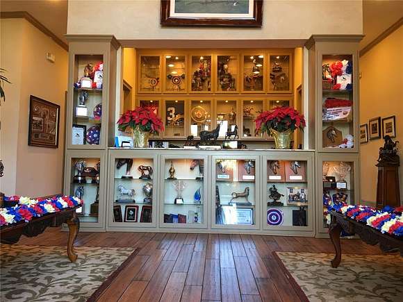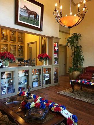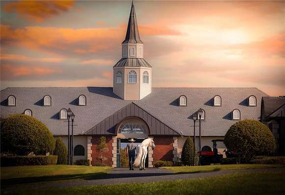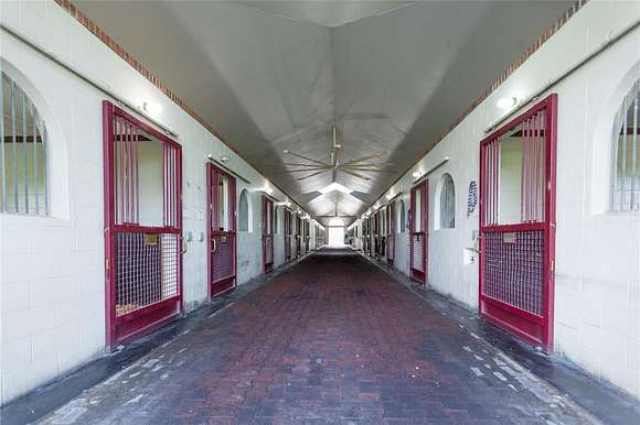 Experience the luxury of a training barn constructed with concrete block and adorned with elegant brick accents. Facility includes 23 premium stalls, (3) 12'X17' foaling stalls, 1/2 bath, lab area, feed room, and an inviting 1/1 apartment. European free walker, with an inner covered riding area, & round pen surrounded by meticulously landscaped areas illuminated by uplighting. The general manager's residence boasts approximately 1,884 +/- SF of living space, featuring vaulted ceilings, aluminum sash windows, & stylish decorative lighting throughout. The interior is thoughtfully designed with 4 bedrooms & 2 baths, including an owner's suite with a spacious bathroom. Additional property highlights include covered porches, beautifully landscaped grounds, & a secure gated entrance. Maintenance shop includes a 20'X30' office, workshop with a half bath & ample storage alongside 3,617 SF of work area with 2 overhead roll-up doors. A spacious 5,442+/-SF parking area ensures abundant space for all your needs. 3 Bedroom, 3 bath employee home. Elevated loading docks are conveniently located near the breeding & stallion barns, featuring four efficient loading stations. All barn roofs have been recently replaced